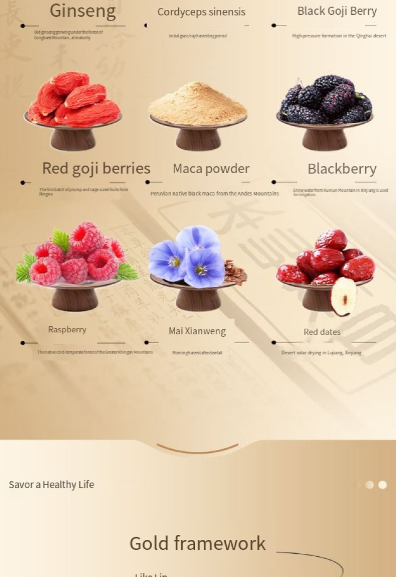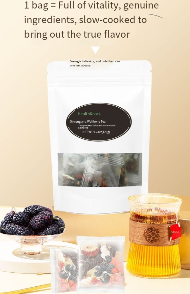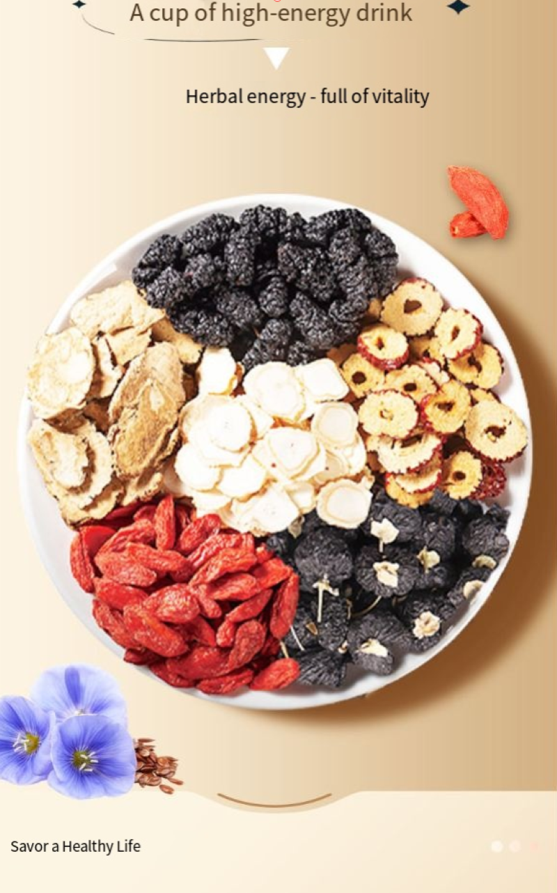 Nove ingredientes, incluindo amora-de-lupa, amoreira, inhame, tâmaras vermelhas, longan, inhame, semente de coix, semente de lótus e alcaçuz, são cuidadosamente selecionados e cada um é escolhido com cuidado: a amoreira nutre os rins e melhora a visão, a amoreira nutre o yin e suplementa o sangue, o inhame tonifica o qi e nutre o yin. Combinado com tâmaras vermelhas e longan para aquecer e fortalecer o corpo. Inhame, semente de coix e semente de lótus nutrem o baço e o estômago, e a semente de lótus acalma o coração e acalma os nervos. O alcaçuz harmoniza todos os sabores e funciona de forma sinérgica, garantindo nutrição sem ficar seco ou gorduroso. É seguro para todas as idades, homens, mulheres e crianças, aproveitarem.