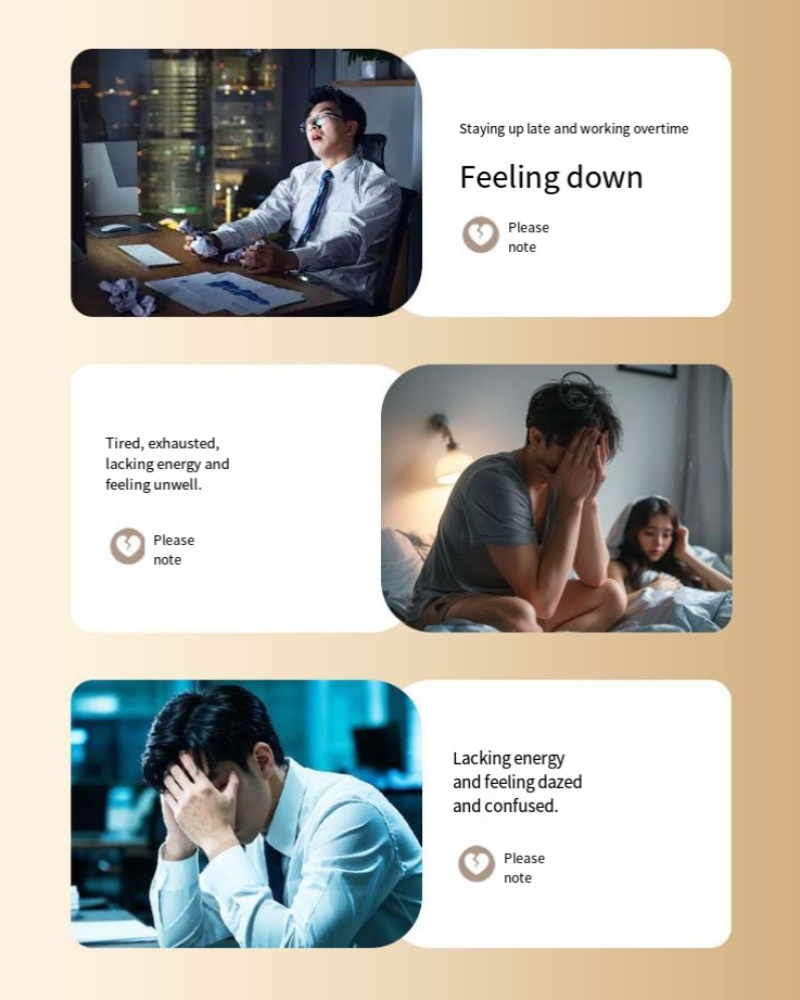 Trabalhadores de escritório: Ficar sentado por longos períodos, fadiga de ficar acordado até tarde e fazer horas extras, beber um copo para recuperar energia e aliviar a fadiga física;