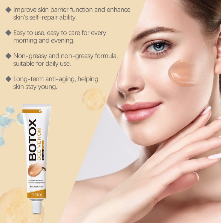 Seu ingrediente principal é extrato de veneno de abelha + acetil hexapeptídeo-8: O veneno de abelha imita o sinal de "microestimulação", estimulando a produção de colágeno na pele; O hexapeptídeo atua como um "dispositivo de ferro à base da pele", alisando suavemente linhas finas no rosto. Sem a forte estimulação dos tratamentos médicos, simplesmente aplicá-lo diariamente pode reduzir gradualmente linhas secas e pregas nasolabiais ao redor dos olhos, e a textura da pele ao usar um rosto simples também se torna mais delicada.