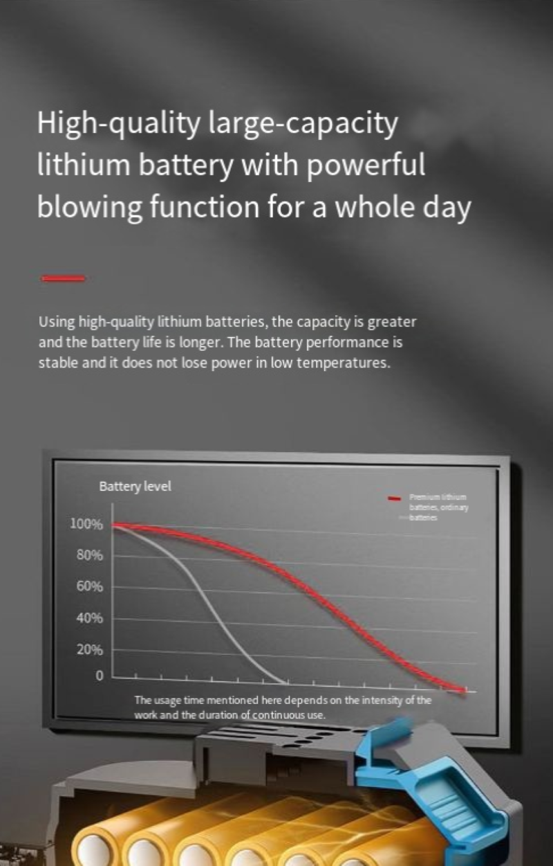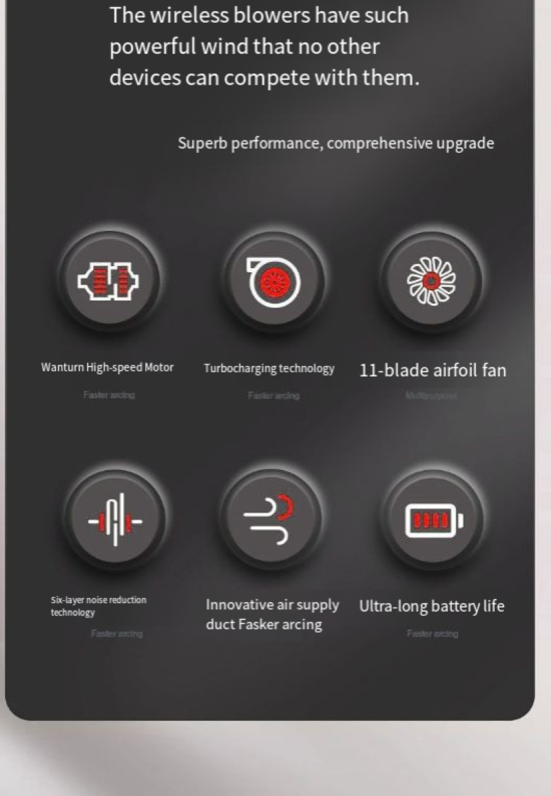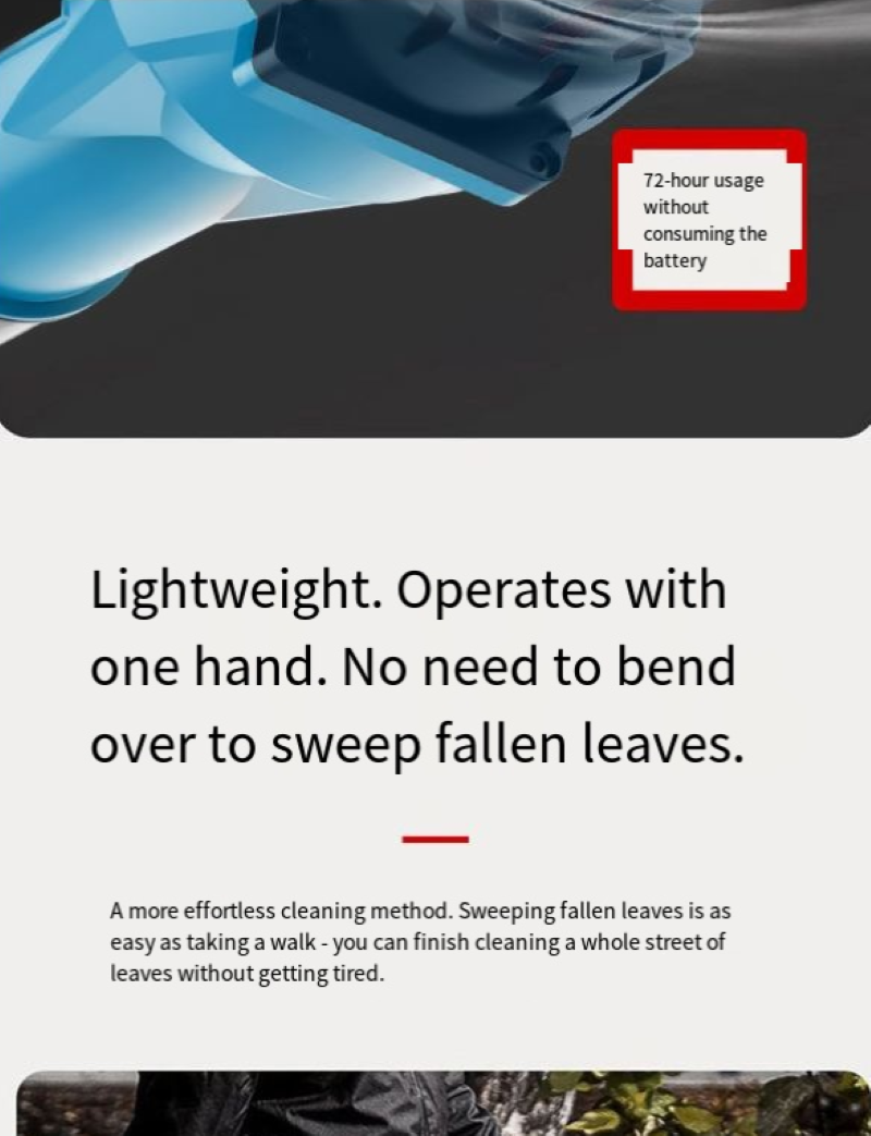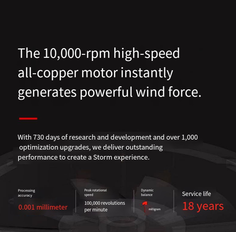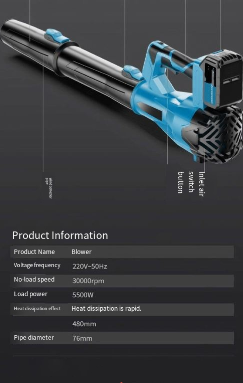 Equipado com um duto de ar de fluxo axial turboalimentado e um motor de cobre de alta velocidade de 10 convoluções, a energia eólica é tão forte que pode rivalizar com a força de um tufão de 14º nível. Ele pode varrer instantaneamente detritos, como folhas caídas, poeira e lascas de madeira. Ao limpar as folhas caídas no quintal, o trabalho que costumava levar meia hora agora pode ser concluído em apenas alguns minutos. Ao tirar o pó no canteiro de obras, mesmo o pó de cimento teimoso pode ser "varrido completamente". No inverno, soprar neve é ainda mais fácil - camadas espessas de neve podem ser "sopradas" em formas dispersas e derretidas.