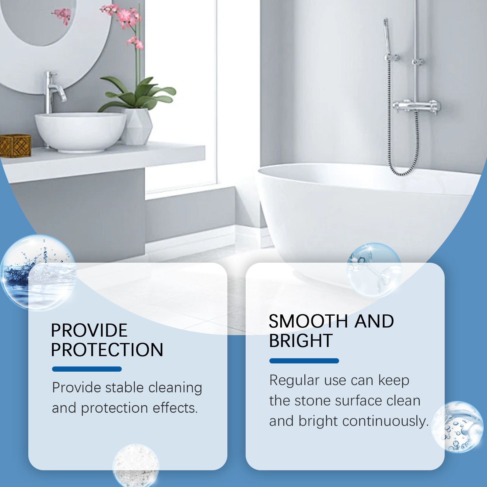 A fórmula natural é suave e não irritante, podendo ser usada em bancadas de cozinha e banheiro, azulejos do piso do banheiro e mesas de centro de mármore. Use-a diariamente, e ela não só restaura o brilho opaco da pedra antiga e faz a superfície brilhar novamente, mas também aumenta a dureza da pedra e reduz o desgaste e os riscos diários. Este frasco pequeno de 100ml é super fácil de usar: limpe a superfície e borrife uniformemente, depois limpe suavemente com um pano. Economiza tempo, economiza mão de obra e é econômico – uma garrafa pode economizar o dinheiro gasto na loja de manutenção de pedras, permitindo que a pedra da sua casa dure "renovada" e mantendo sua cozinha e banheiro limpos e iluminados o tempo todo.