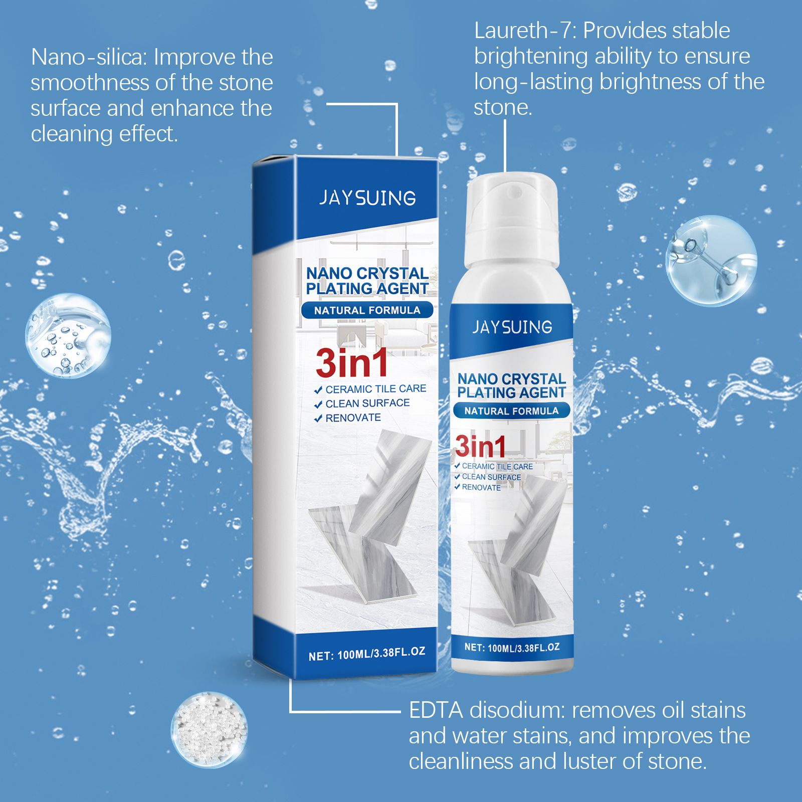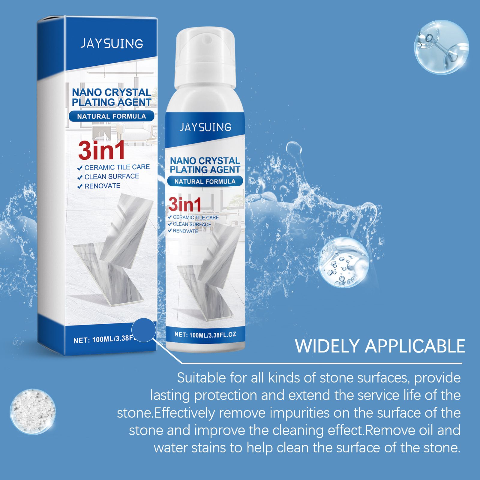 Os azulejos e o mármore da sua casa estão ficando amarelos, manchando e ficando impossíveis de limpar? JAYSUING Nano Crystal Coating vem ao resgate! Este frasco de "3-em-1 Stone Care Wonder" usa tecnologia nano black para dar à pedra uma camada de "roupa invisível de proteção" – Borrife e ela não só limpa rapidamente a sujeira superficial, como também forma uma película protetora de alta dureza na superfície da pedra, proporcionando proteção à prova d'água e antimanchas. Manchas de café e derramamentos de óleo saem com um lenço, e você não precisará mais se preocupar com manchas teimosas.
