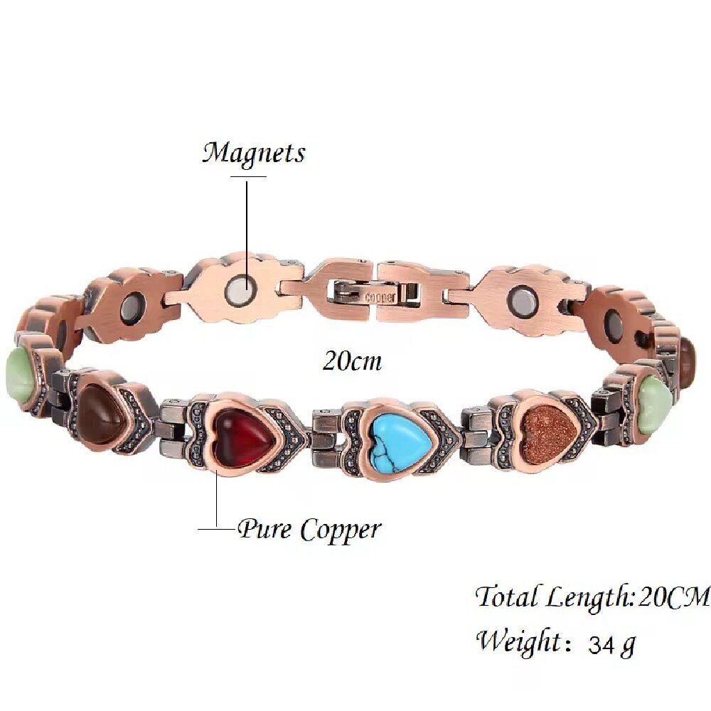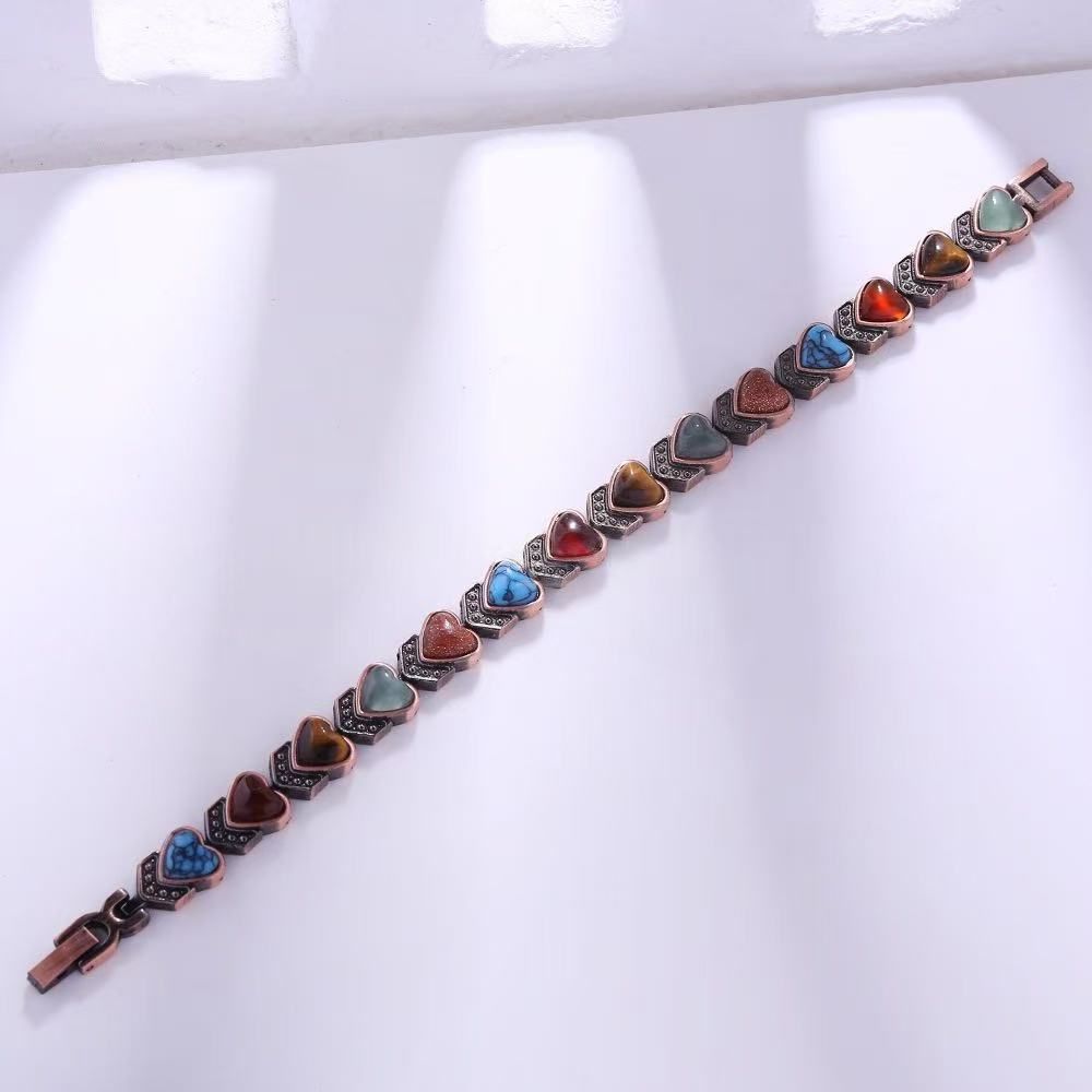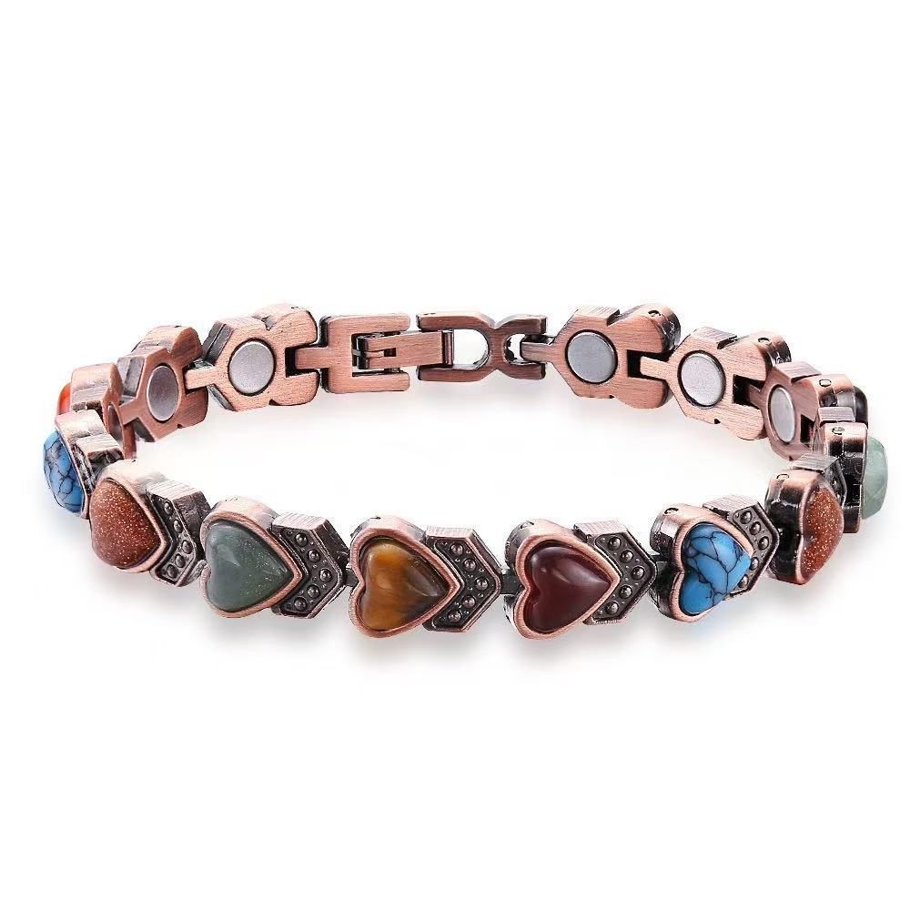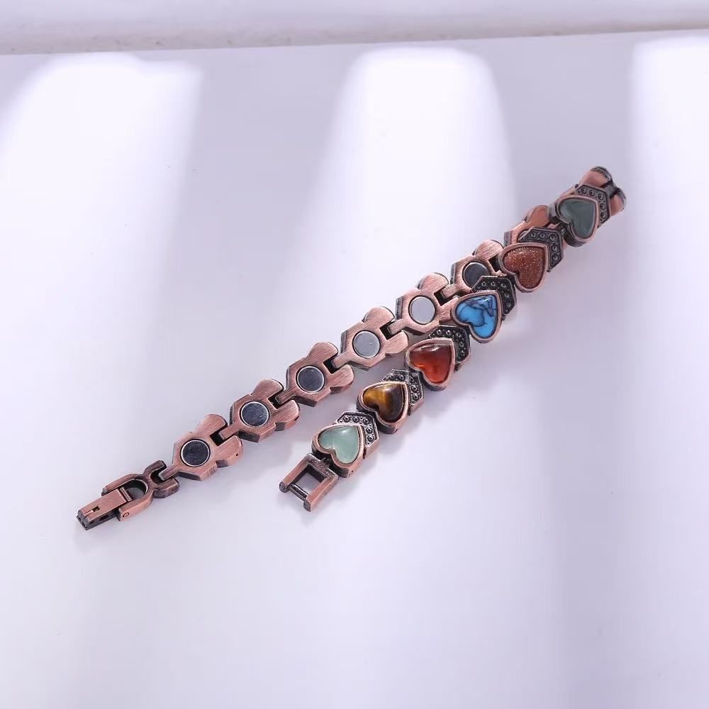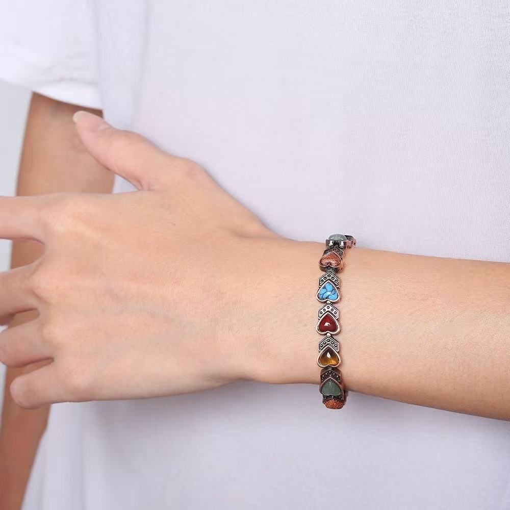 Esta pulseira ímã turquesa oferece um duplo prazer de "qualidade de aparência + poder de cura". A corrente de cobre retrô destaca uma textura suave, enquanto as pedras turquesa naturais e as pedras preciosas multicoloridas em forma de coração são combinadas, tornando-a uma peça de destaque para qualquer look. Com corrente de 20cm e um leve 34g, pode ser usado confortavelmente tanto para deslocamentos quanto para ocasiões casuais.