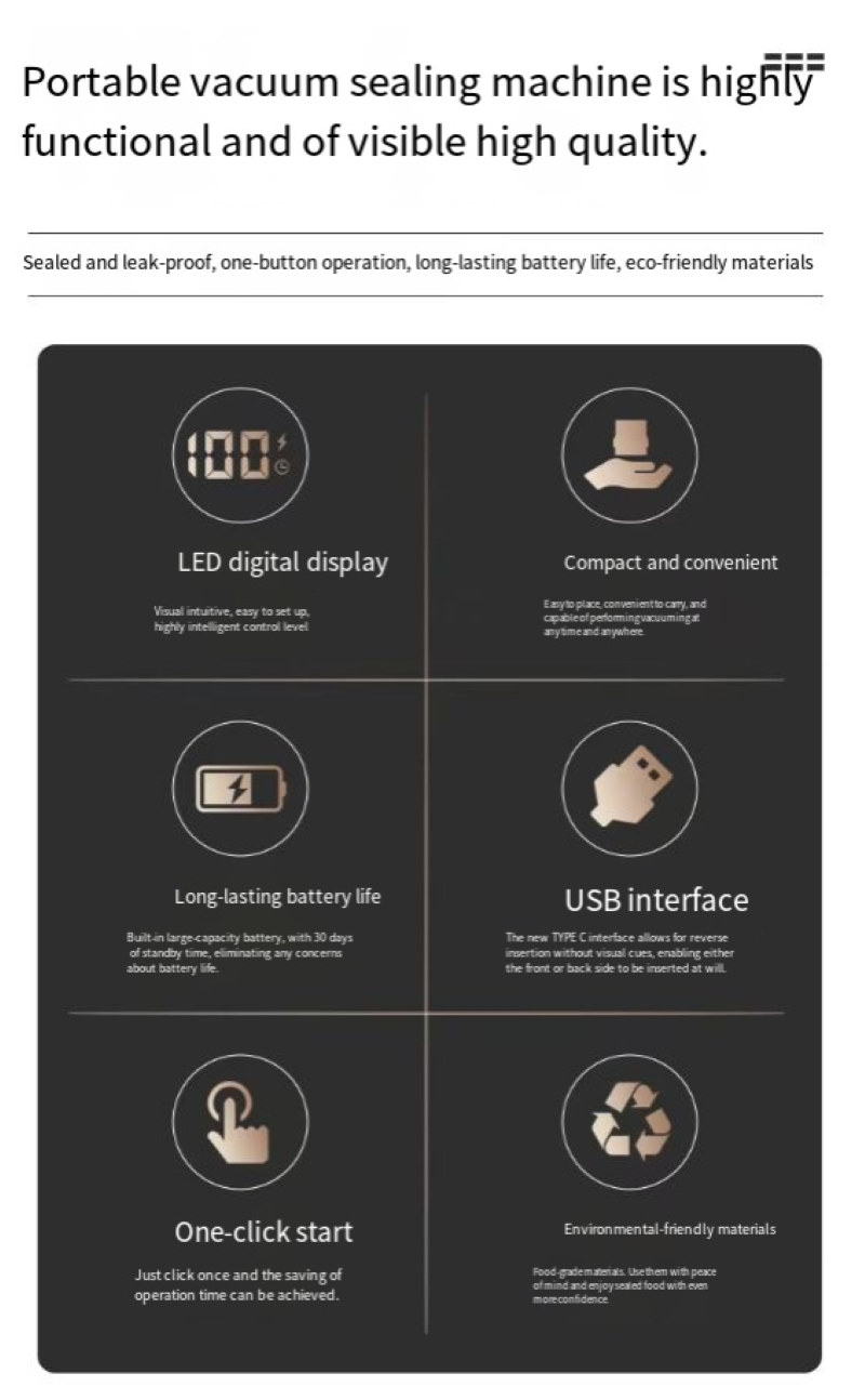 - One-click start, enjoy convenience: Say goodbye to cumbersome operations. Just press a button, the electric vacuum pump starts working rapidly, automatically completing the vacuum pumping and sealing process. No need to manually exert effort to pump air out. Easily enjoy the efficient preservation experience brought by technology, even the elderly and children can quickly master it.