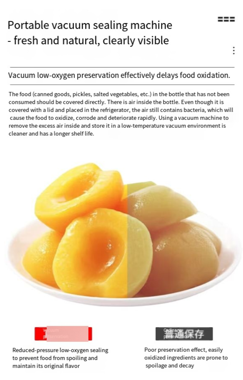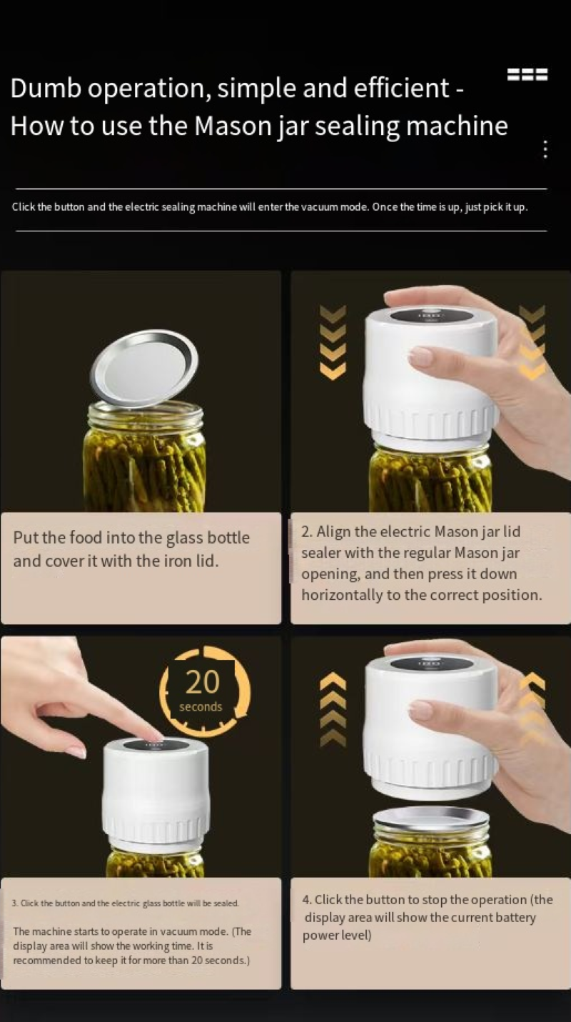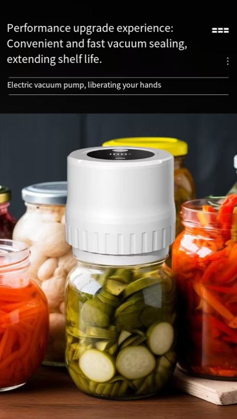 Are you worried about food spoilage? Are you tired of manually pumping air out? This upgraded Mason Jar Vacuum Sealing Machine, with technology, redefines preservation. With just one click, it automatically completes the vacuum pumping and sealing process. It frees your hands and keeps freshness for a long time, preserving deliciousness~