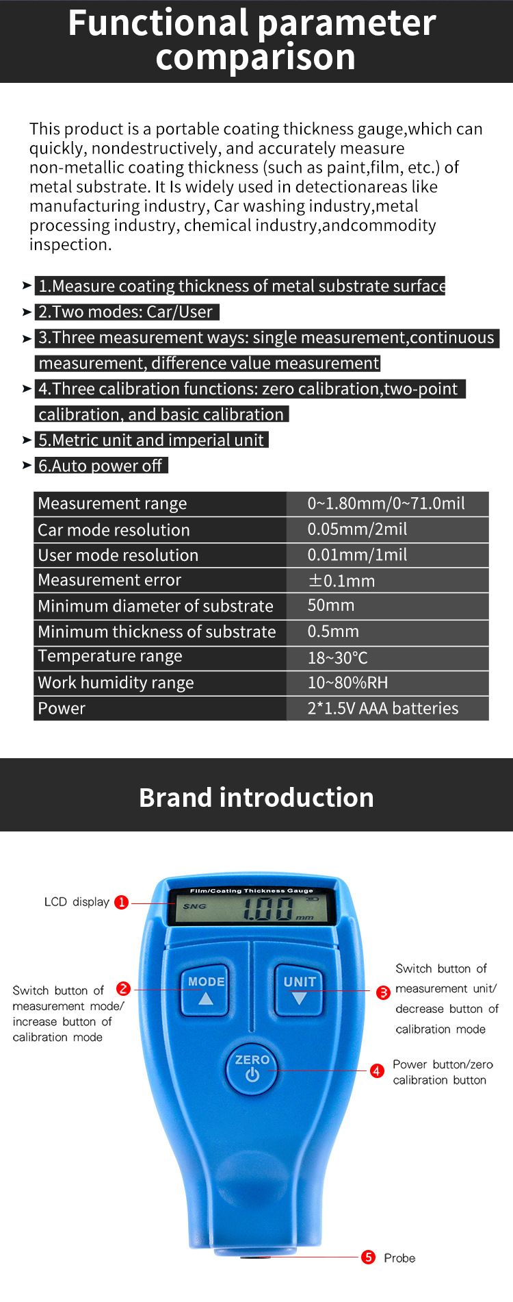 It is specifically designed for measuring the thickness of non-metallic coatings on metal substrates, such as paint and films. The measurement range covers 0 to 1.8mm, with an error of only ±0.1mm, and its accuracy far exceeds the industry average level. Whether it is for quality control of manufacturing products, paint surface inspection in the automotive cleaning industry, coating monitoring in metal processing and chemical industries, or in the field of commodity inspection, it can perform outstandingly.