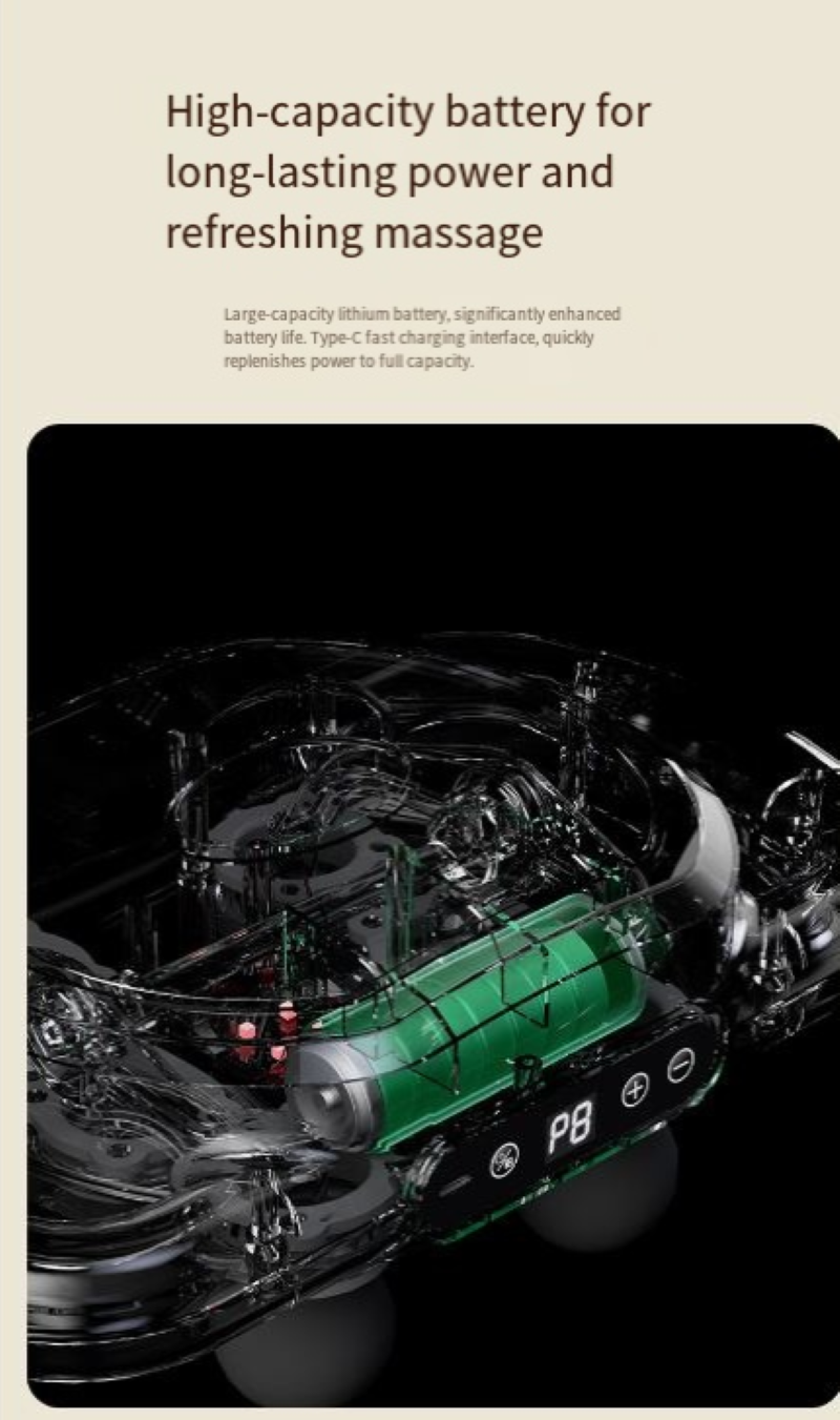 Motor silencioso: funcionando quase sem ruído, mesmo quando usado no escritório ou no quarto, não incomoda os outros, permitindo que você desfrute do prazer do relaxamento muscular em "silêncio".