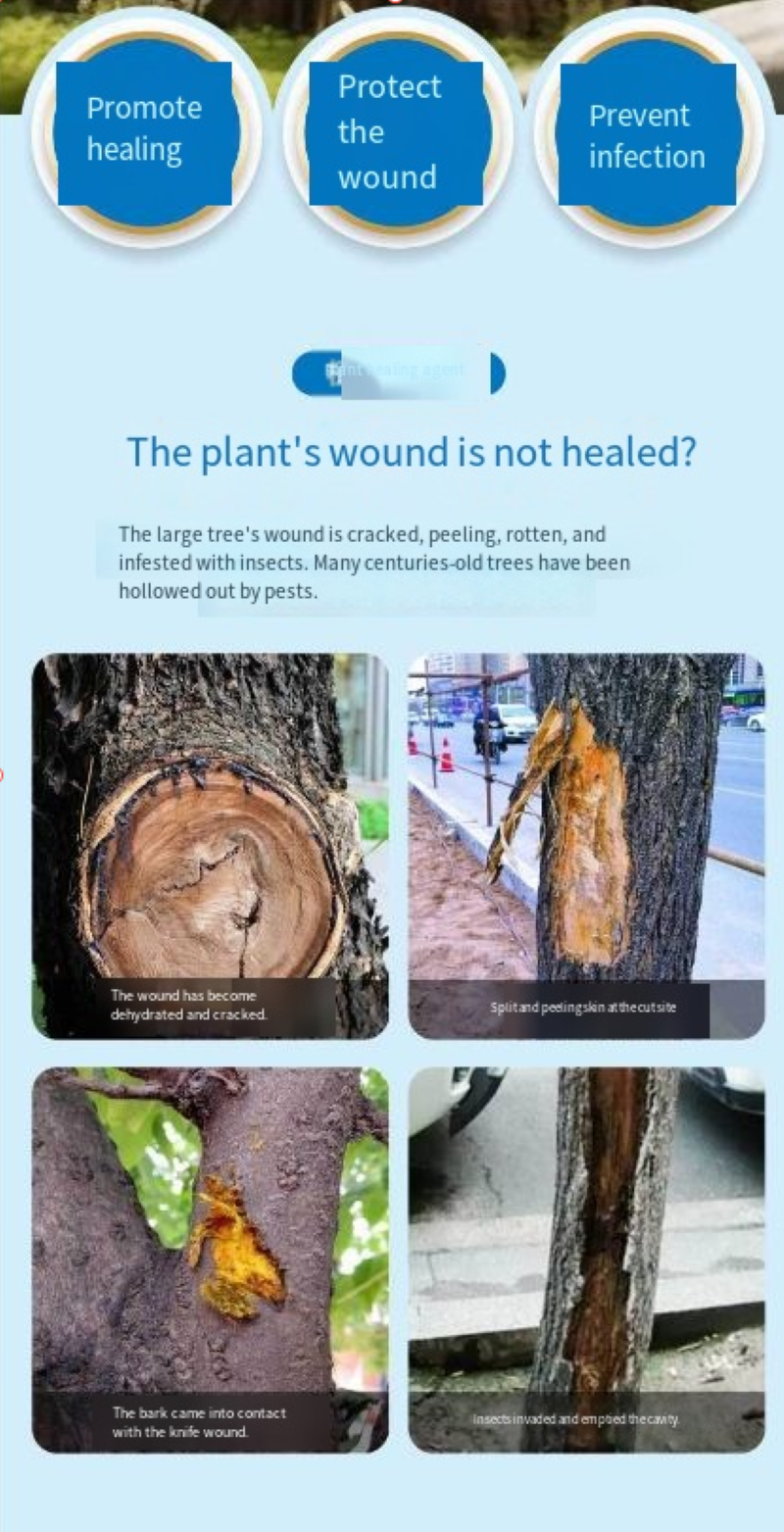 Seu escopo de aplicação é extremamente amplo, abrangendo diversas árvores paisagísticas de jardim, árvores frutíferas e preciosas árvores antigas. Quando usado em transplante de árvores, pode aumentar significativamente a taxa de sobrevivência; Quando usado em poda, modelagem, enxertia, etc., pode promover a cicatrização de feridas e reduzir o risco de infecção; Para o tratamento de rejuvenescimento de árvores antigas e famosas, ela também pode desempenhar um papel importante, ajudando as árvores antigas a recuperar vitalidade.