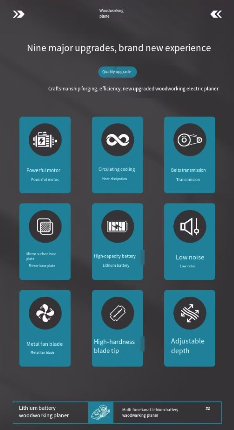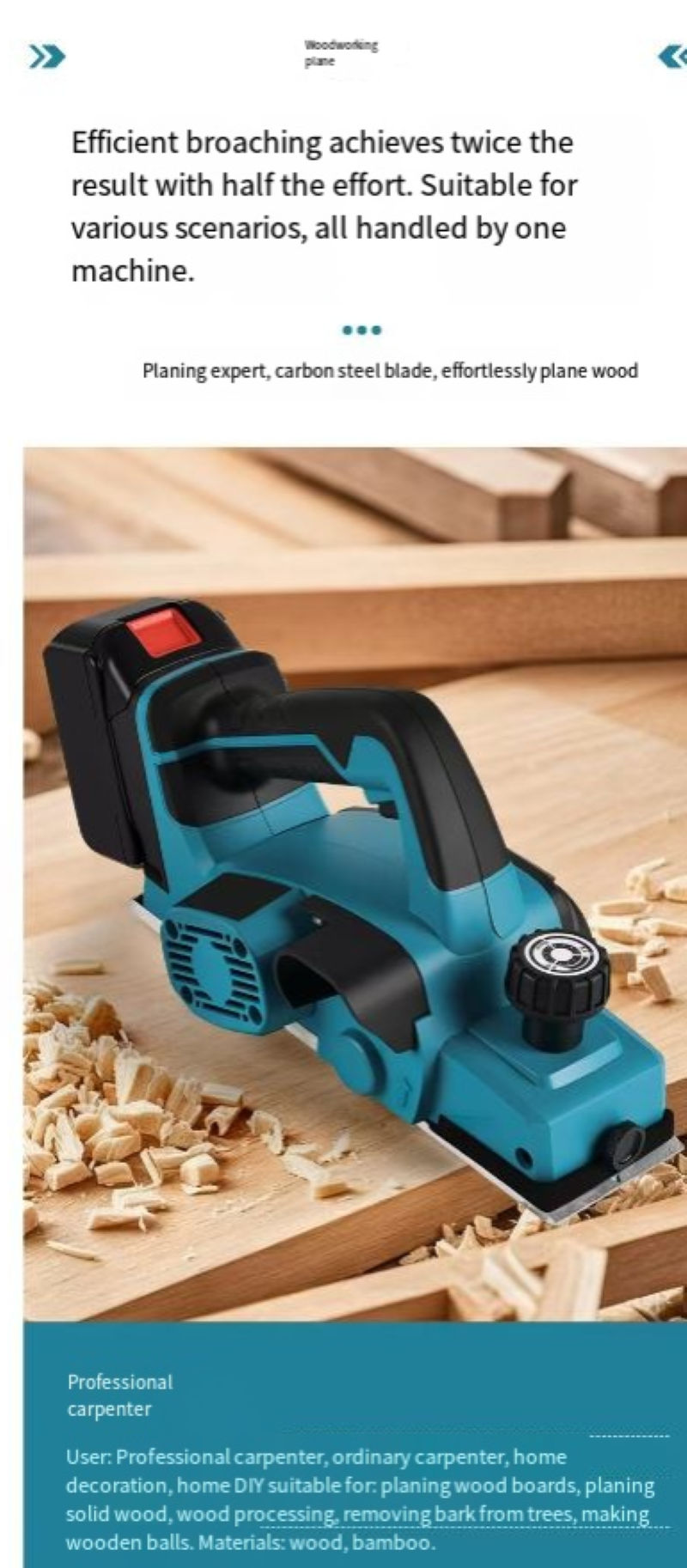 Essa plaina recarregável de madeira de bateria de lítio é uma escolha ideal para entusiastas e profissionais da marcenaria. Ele integra múltiplas funções e pode lidar com diversas tarefas com facilidade, seja ajuste de profundidade, corte eficiente ou lidar com cenários complexos. Diga adeus à complexidade das plainas tradicionais para marcenaria e abrace a conveniência e eficiência da era da marcenaria movida a lítio.