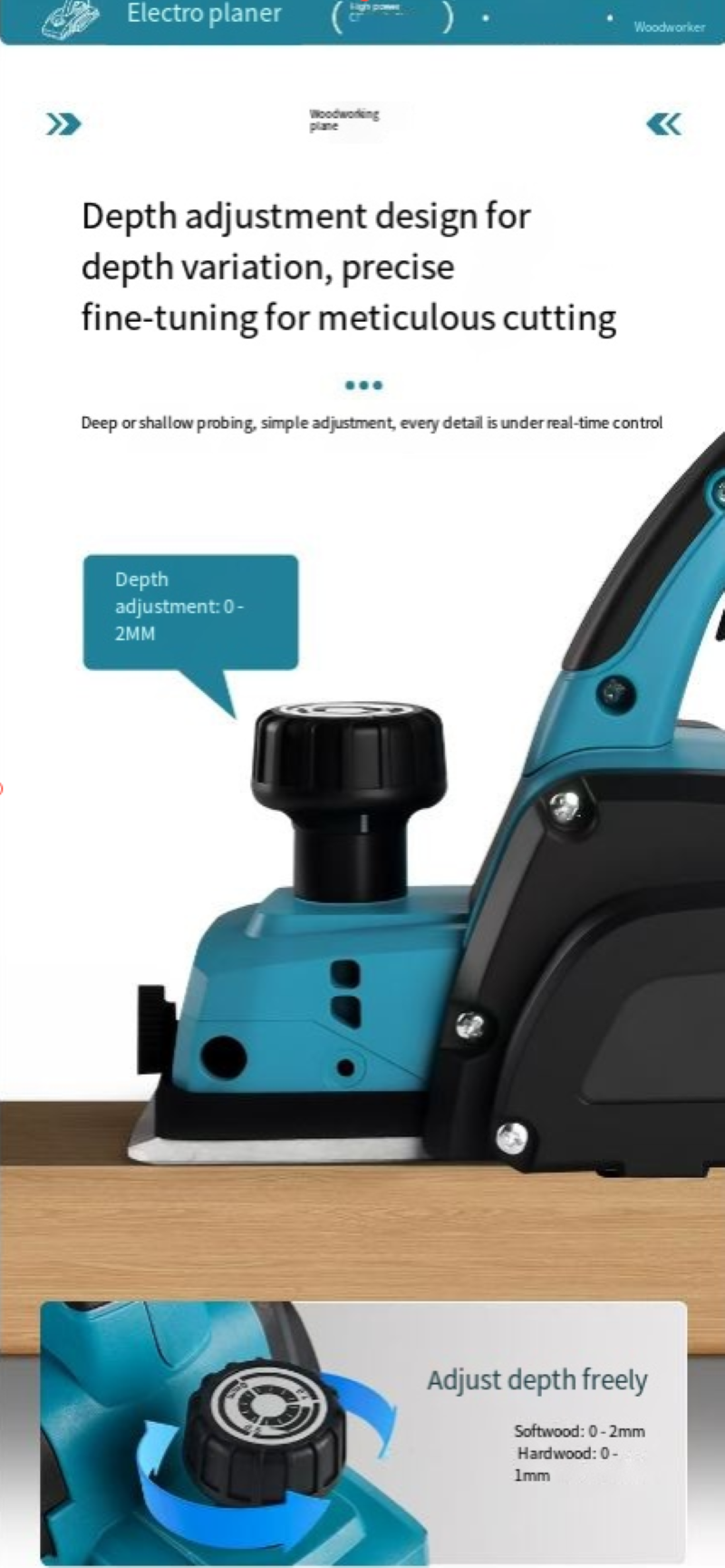 Ajuste profundo, controle preciso: Com excelente função de ajuste de profundidade, ele pode ajustar com precisão a profundidade de plaina conforme diferentes madeiras e necessidades de processamento, permitindo que você controle com precisão a espessura da madeira e obtenha o efeito ideal de processamento para cada peça de madeira.