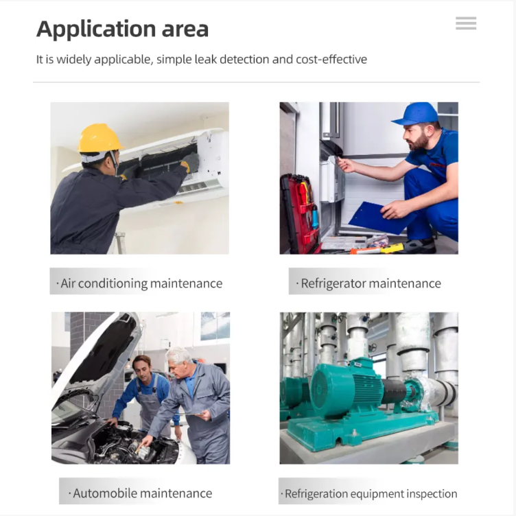For air conditioning maintenance technicians, it is an "efficient leak detection tool", shortening maintenance time and enhancing service professionalism; for auto repair shops, it is an "air conditioning maintenance tool", accurately locating the refrigerant leak points of car air conditioners; for refrigeration equipment operation personnel, it is even a "hidden danger detection assistant", ensuring the stable operation of large refrigeration systems.