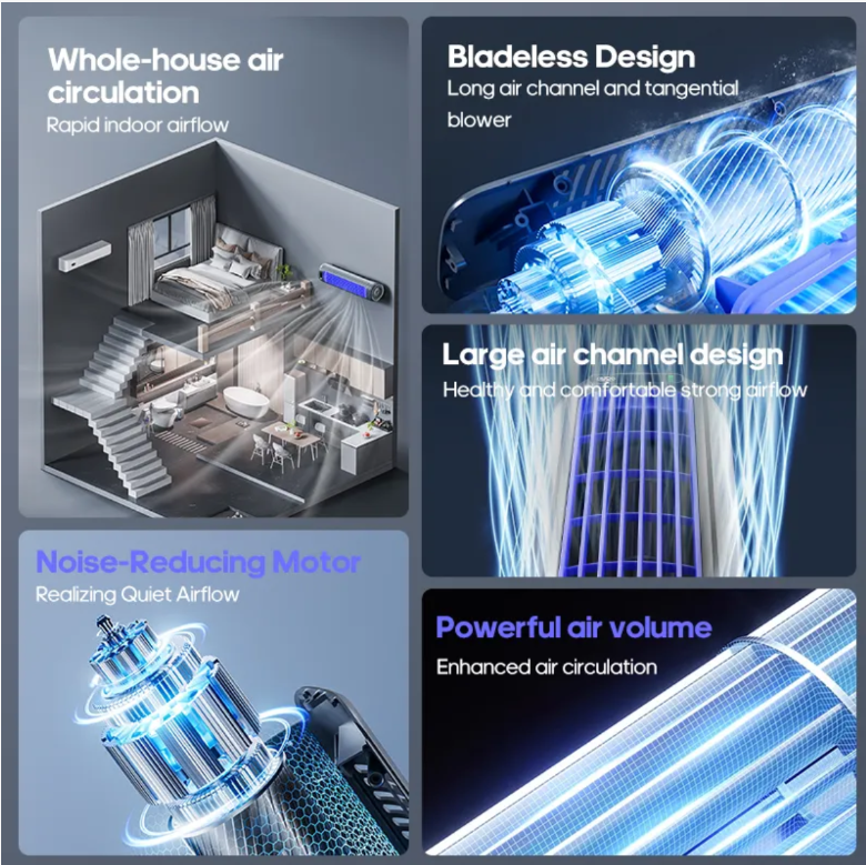 O calor opressivo do verão se infiltra em nossas vidas inesperadamente - a cozinha está queimando enquanto cozinha, o quarto fica abafado durante o sono e o ventilador tradicional na mesa ocupa espaço e é barulhento ... Não deixe que esses pequenos aborrecimentos prejudiquem a qualidade de vida. Este ventilador de circulação de ar portátil e autônomo sem lâminas, com seu desempenho geral de "segurança sem pás + compatibilidade com vários cenários + vento forte e baixo ruído", cria um espaço fresco para você, garantindo que cada centímetro de ar seja preenchido com conforto.