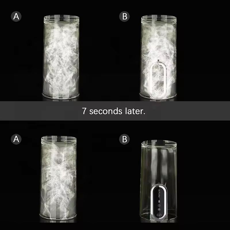 Embora seja pequeno em tamanho, sua capacidade de purificação é extremamente forte. É equipado com um núcleo de filtro eficiente, que pode adsorver e filtrar rapidamente substâncias nocivas como PM2.5, pólen e moléculas de odor no ar. Assim como o que é mostrado na Figura 5, mesmo que a área circundante esteja cheia de várias partículas de poluição, ela pode, por meio de sua poderosa capacidade de purificação, criar um pequeno mundo limpo ao seu redor.