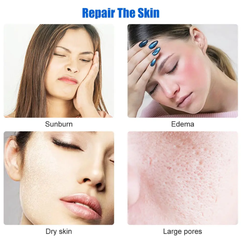 - Reparo pós-sol: Para vermelhidão e queimação pós-sol, o relevo gelado esfria instantaneamente e repara a barreira danificada;