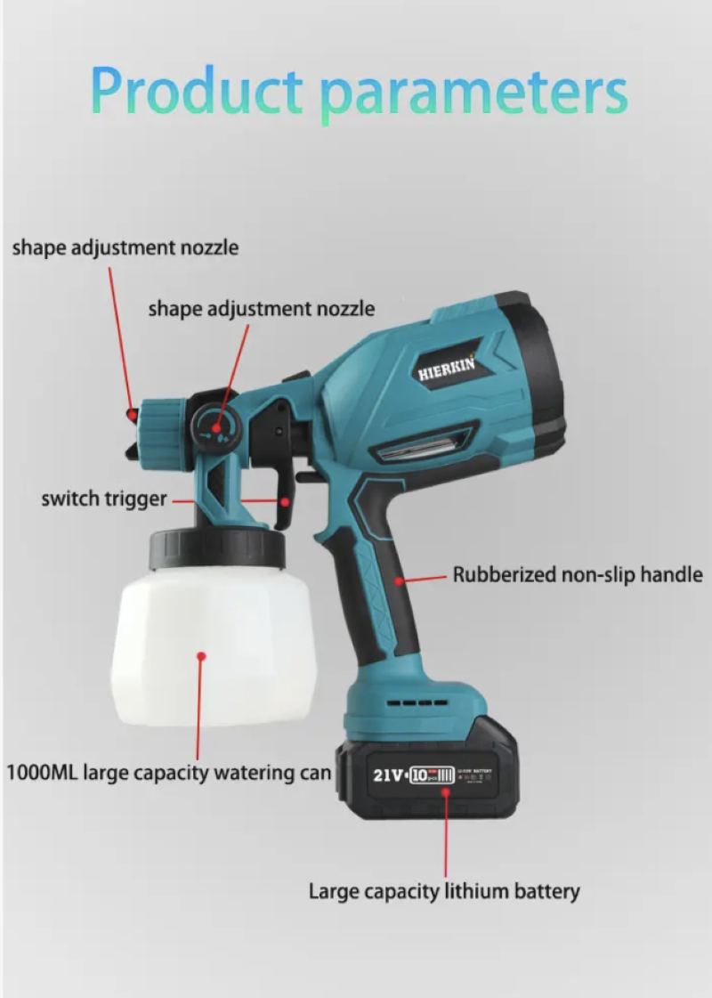 Esta pistola de pulverização alimentada por bateria de lítio oferece várias vantagens, como "liberdade de operação trazida por uma poderosa bateria de lítio, revestimento fino obtido por meio de atomização eficiente, ajuste de vários níveis adequado para todos os cenários, design ergonômico para reduzir a fadiga operacional e fácil desmontagem e limpeza para simplificar os procedimentos de manutenção". Esses recursos revolucionaram a experiência de pintura em todos os aspectos. Quer se trate de profissionais de pintura ou usuários domésticos que amam bricolage, eles podem usá-lo para concluir várias tarefas de pintura com facilidade e eficiência, transformando a pulverização de uma tarefa complicada e restrita em um processo criativo conveniente e agradável. Pode ser considerado um "poderoso assistente" no campo da pintura, proporcionando uma melhor solução para operações de pintura em diferentes cenários.