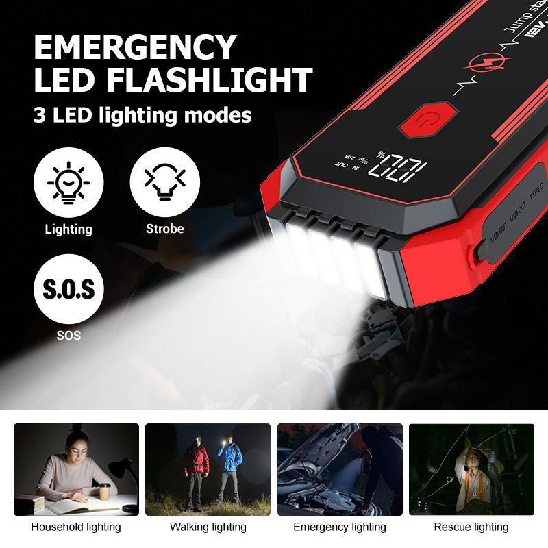 Ele vem com uma lanterna LED de emergência com três modos de iluminação: luz forte, estroboscópio e SOS. Ele pode ser usado para iluminação e manutenção quando seu carro quebra à noite, como fonte de luz para aventuras ao ar livre e até mesmo enviar sinais SOS em emergências. É altamente prático e serve como um auxílio de segurança para suas atividades de direção e ao ar livre.