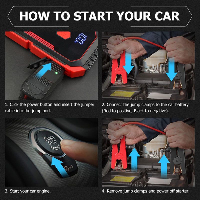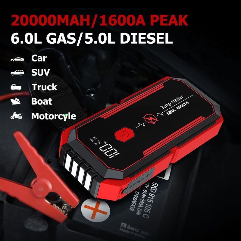 Com uma corrente de pico de 1600A, ele pode facilmente dar partida em veículos a gasolina de 6.0L e veículos a diesel de 5.0L, abrangendo sedãs, SUVs, caminhões, motocicletas e muito mais. Esteja você viajando diariamente ou dirigindo longas distâncias, quando a bateria do seu carro acabar, basta conectá-la simplesmente e reviver seu carro em segundos, sem mais esperar pelo resgate.