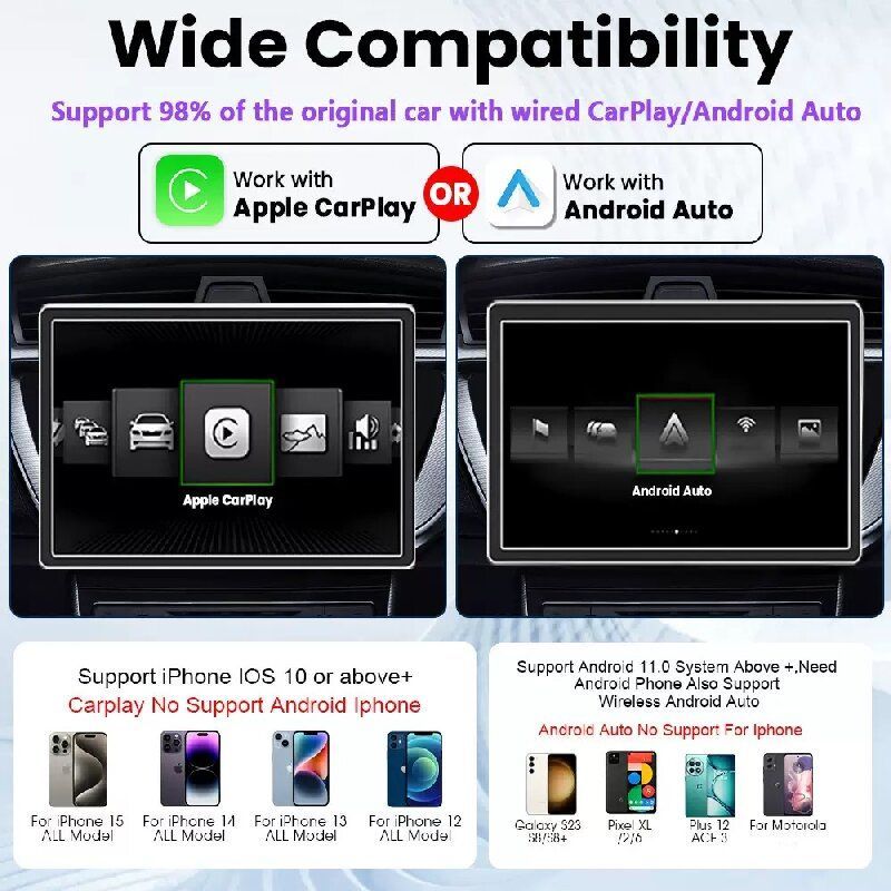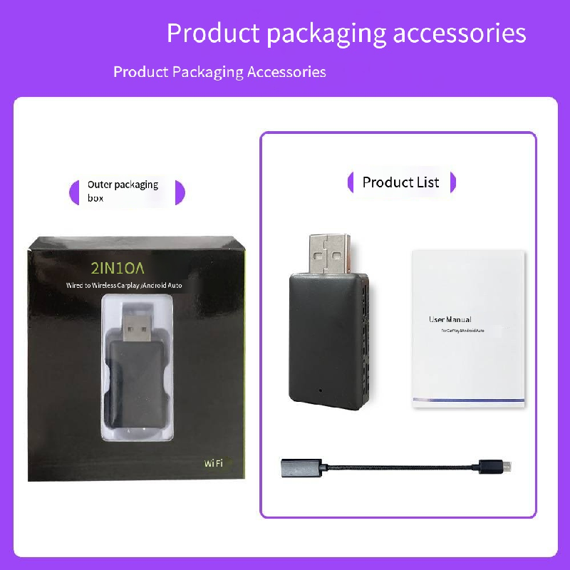 Você ainda está enfrentando as restrições das conexões com fio? Este adaptador de carro sem fio CarPlay/Android Auto abre uma nova era de conectividade no carro para você! É amplamente compatível com vários modelos de carros, plug-and-play, sem a necessidade de operações complicadas. Os usuários da Apple podem desfrutar da navegação, música, chamadas e outras funções do CarPlay, e os usuários do Android também podem obter integração perfeita entre seus telefones e sistemas de infoentretenimento do carro por meio do Android Auto. Quer se trate da exibição clara das condições da estrada durante a navegação ou da comutação livre enquanto ouve música, você pode desfrutar de conveniência inteligente durante a sua condução. Ele vem com um conjunto completo de acessórios, tornando a instalação e o uso tão fáceis. Diga adeus aos suportes de telefone enquanto dirige a partir de agora e torne cada viagem cheia de uma sensação de tecnologia e conforto.