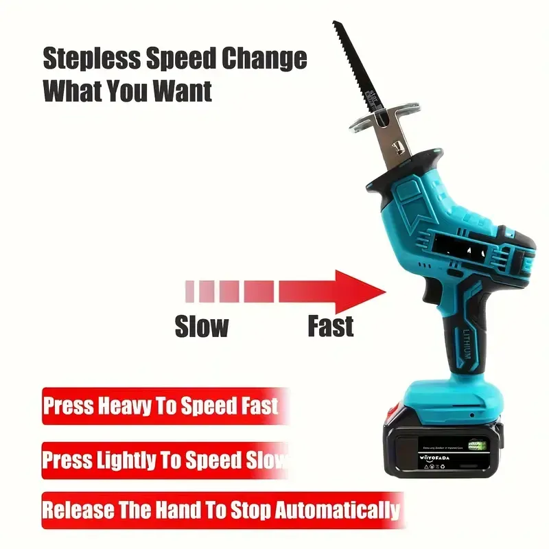 . Desempenho poderoso + controle flexível: Equipado com um motor de alta velocidade e cabeça de serra ajustável, permite cortes precisos em cantos estreitos e para peças irregulares, facilitando o uso para iniciantes.