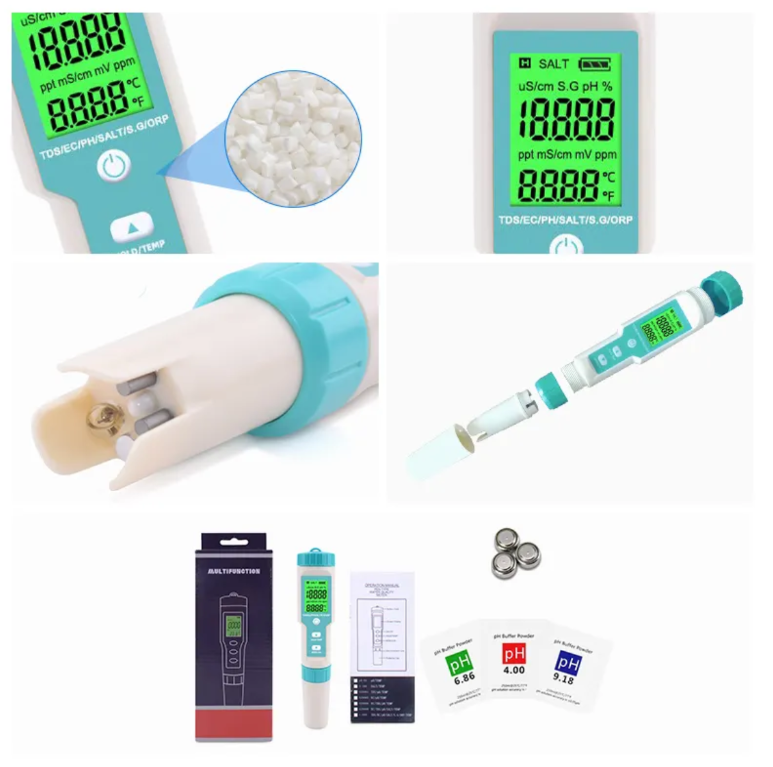 Você ainda está preocupado com a qualidade desconhecida da água afetando sua saúde, agricultura ou plantio? Este detector de qualidade da água 7 em 1 combina 7 indicadores principais, como pH, ORP, EC, TDS, salinidade (SG) e temperatura (°C / °F) em um. É um "mestre" completo da qualidade da água para cenários como uso doméstico de água, aquicultura, jardinagem e uso industrial de água, permitindo que você controle com precisão a qualidade da água e se sinta à vontade sem preocupações.
