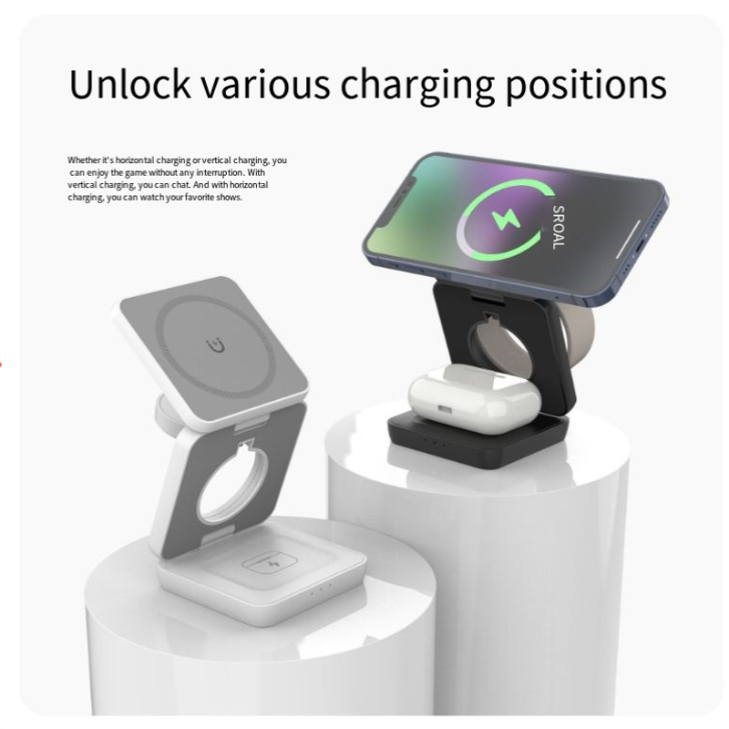 Você ainda se incomoda com cabos de carregamento emaranhados e ângulos estranhos ao carregar seus dispositivos? Este carregador magnético dobrável sem fio três em um, com seu carregamento magnético rápido, portabilidade dobrável e ajuste de vários ângulos, tornou-se o "rei do carregamento completo" para usuários de telefones celulares, fones de ouvido e relógios.