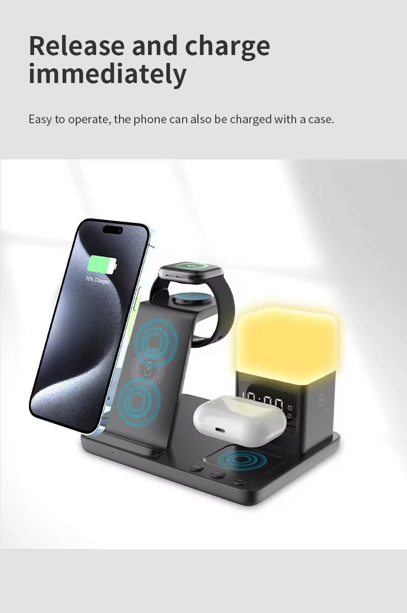 Sua função "6 em 1" é uma "solução definitiva" para carregamento de desktop: ele pode carregar iPhone, AirPods e iWatch sem fio e também integra funções de despertador, luz noturna e relógio. De manhã, seu telefone, fones de ouvido e relógio são despertados durante o carregamento e o alarme toca na hora certa; À noite, a luz noturna suave ilumina sua área de trabalho e o relógio mostra claramente a hora, permitindo que você gerencie o tempo e a iluminação durante o carregamento, obtendo vários benefícios.