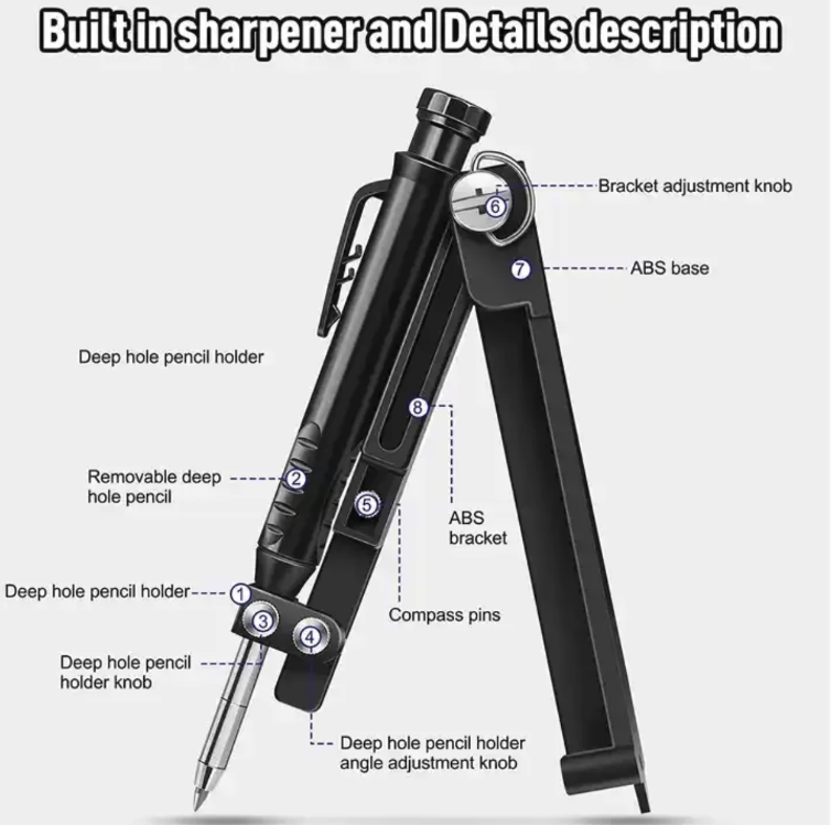 Especialista em marcação de furos profundos: Componente de lápis de furo profundo destacável, com um apontador embutido para manter a ponta da caneta afiada o tempo todo. Pode marcar com precisão em furos estreitos e profundos, adequado para vários materiais, como cerâmica, plásticos, madeira e metais.