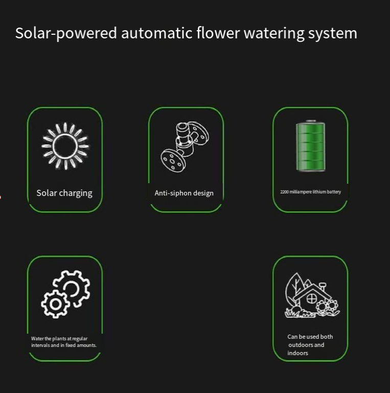 Suas principais vantagens estão na propulsão solar e na irrigação automática inteligente. O painel solar absorve energia solar e a converte em eletricidade, eliminando a necessidade de uma fonte de energia externa. É mais conveniente para varandas externas e pátios cultivar plantas. Combinado com um sistema de controle inteligente, ele pode fornecer água automaticamente de acordo com as necessidades hídricas das plantas. Mesmo que você esteja em uma viagem de negócios por semanas, as plantas em casa podem ser regadas regularmente e não vão se preocupar em murchar por falta de água.
