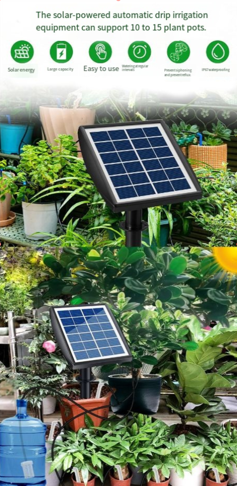 Você sempre esquece de regar as plantas? Preocupado que as plantas fiquem desidratadas durante viagens de negócios ou de viagem? Esta máquina inteligente de irrigação movida a energia solar 1-drag-15 combina tecnologia solar e sistema de irrigação inteligente para eliminar completamente sua "ansiedade de rega" e alcançar facilmente a "liberdade de rega" para suas plantas verdes.