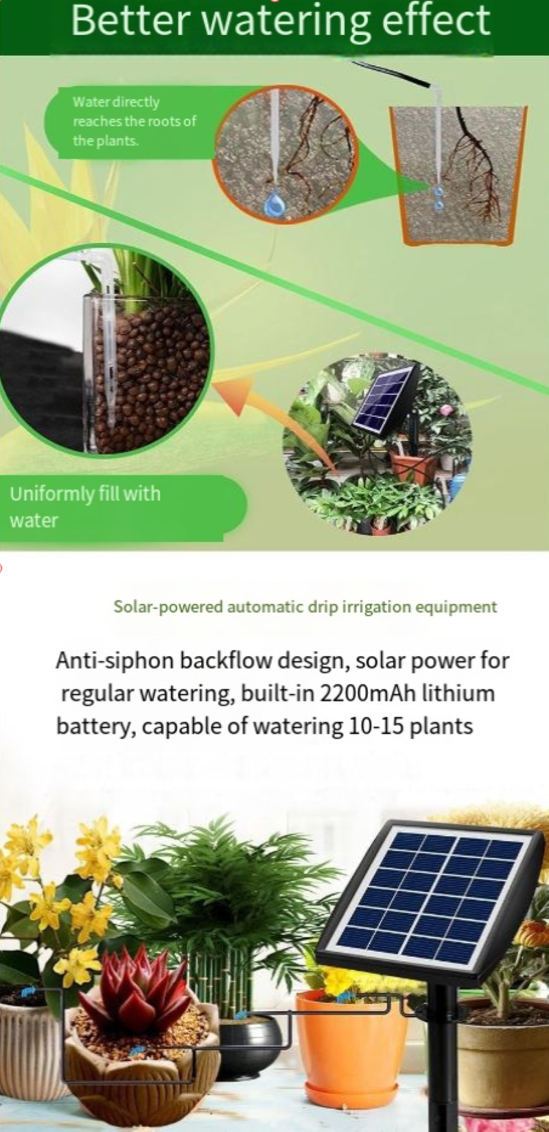 Com ele, você pode fazer viagens de negócios com tranquilidade e desfrutar de umas férias confortáveis. Quando você voltar para casa, será recebido por um jardim exuberante; você também pode deixar suas suculentas mais cheias e suas flores vibrantes, e compartilhar "o jardim de outra pessoa" no WeChat Moments. Não deixe mais a rega limitar seu entusiasmo pelo cultivo de plantas. Pegue esta máquina de irrigação inteligente movida a energia solar 1-drag-15 e deixe que cada planta receba o abastecimento de água adequado e oportuno. Cultivar plantas será mais conveniente e curativo a partir de agora!