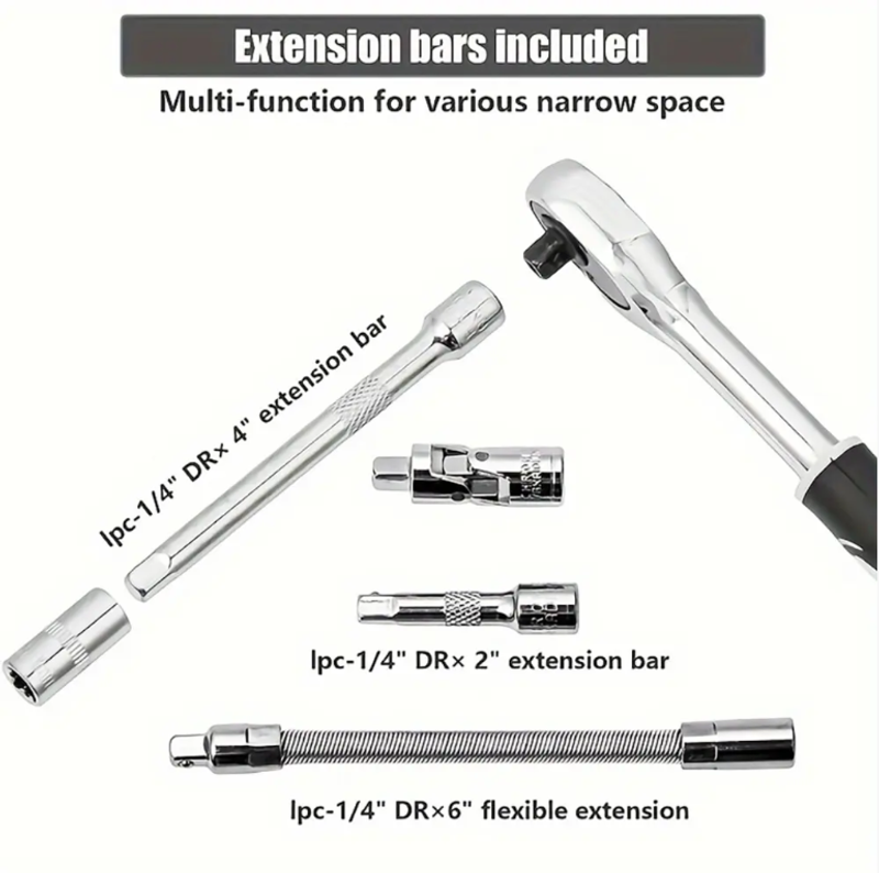 Não é uma "chave inglesa única", mas um "kit multiuso" que reúne todas as ferramentas comuns: inclui soquetes de vários tamanhos (adequados para parafusos de diferentes espessuras), brocas hexagonais quadradas/inclinadas/internas (parafusos de cobertura para móveis e dispositivos eletrônicos), hastes de extensão longas e curtas + hastes flexíveis e macias (adequadas para diferentes espaços), desde pequenos parafusos de desmontagem de telefones até parafusos grossos de pneus de carro, desde fixar ferragens de guarda-roupas até porcas dos painéis traseiros de eletrodomésticos. Não há mais necessidade de vasculhar gavetas e armários para procurar ferramentas. Este conjunto está totalmente equipado com todas as especificações e pode ser usado diretamente quando for pego.