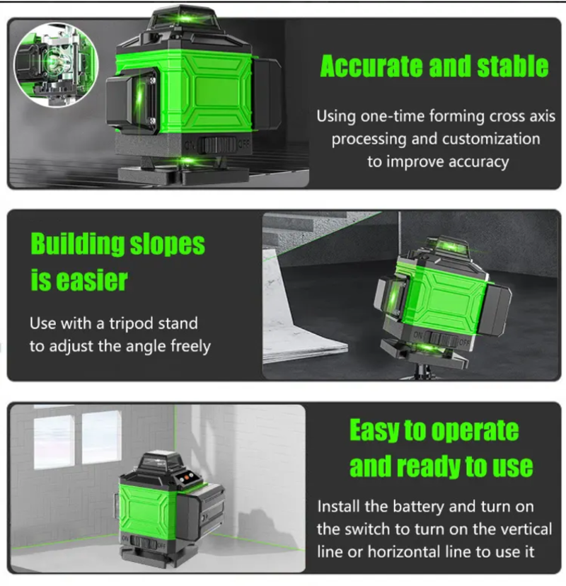 Como uma ferramenta de construção de nível profissional, pode projetar linhas de laser tridimensionais 3D, cobrindo toda a área de construção. Seja nivelando paredes e pisos, ou posicionamento vertical durante a instalação de portas, janelas e móveis, ele pode fornecer referências precisas, garantindo a precisão da construção e garantindo que cada detalhe da construção atenda aos requisitos. Além disso, seu design é robusto e durável, capaz de se adaptar a vários ambientes em canteiros de obras, com excelente resistência a choques e desempenho à prova de poeira, fornecendo suporte confiável para aplicações de construção de longo prazo e alta frequência. Com ele, a construção precisa não é mais difícil e ajuda a obter uma conclusão de alta qualidade dos projetos de construção.