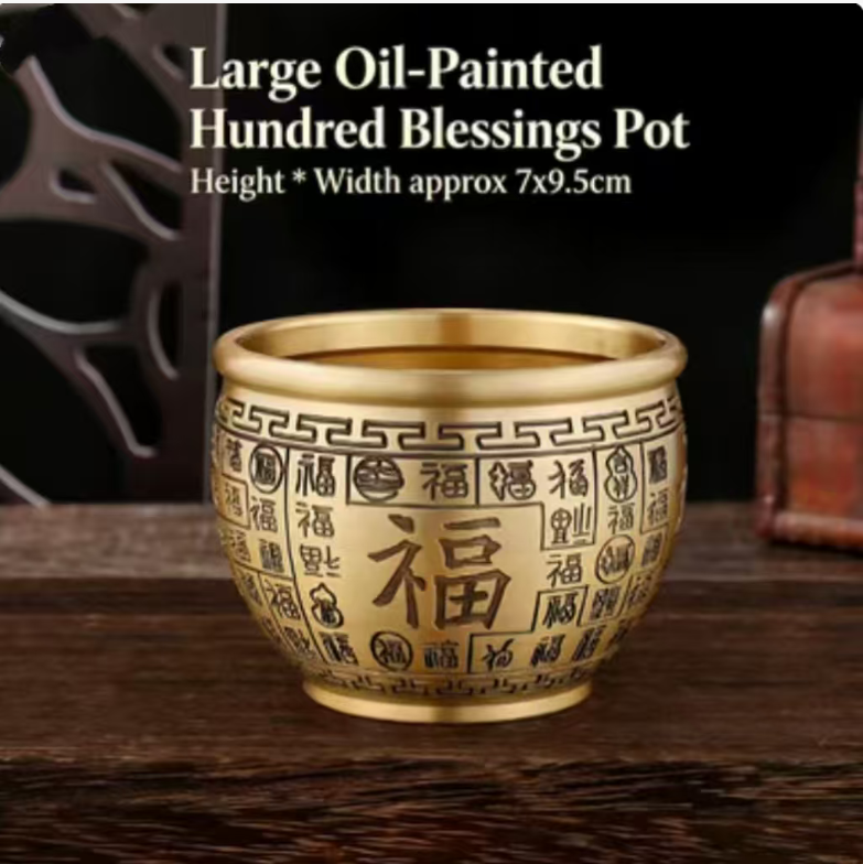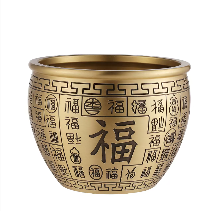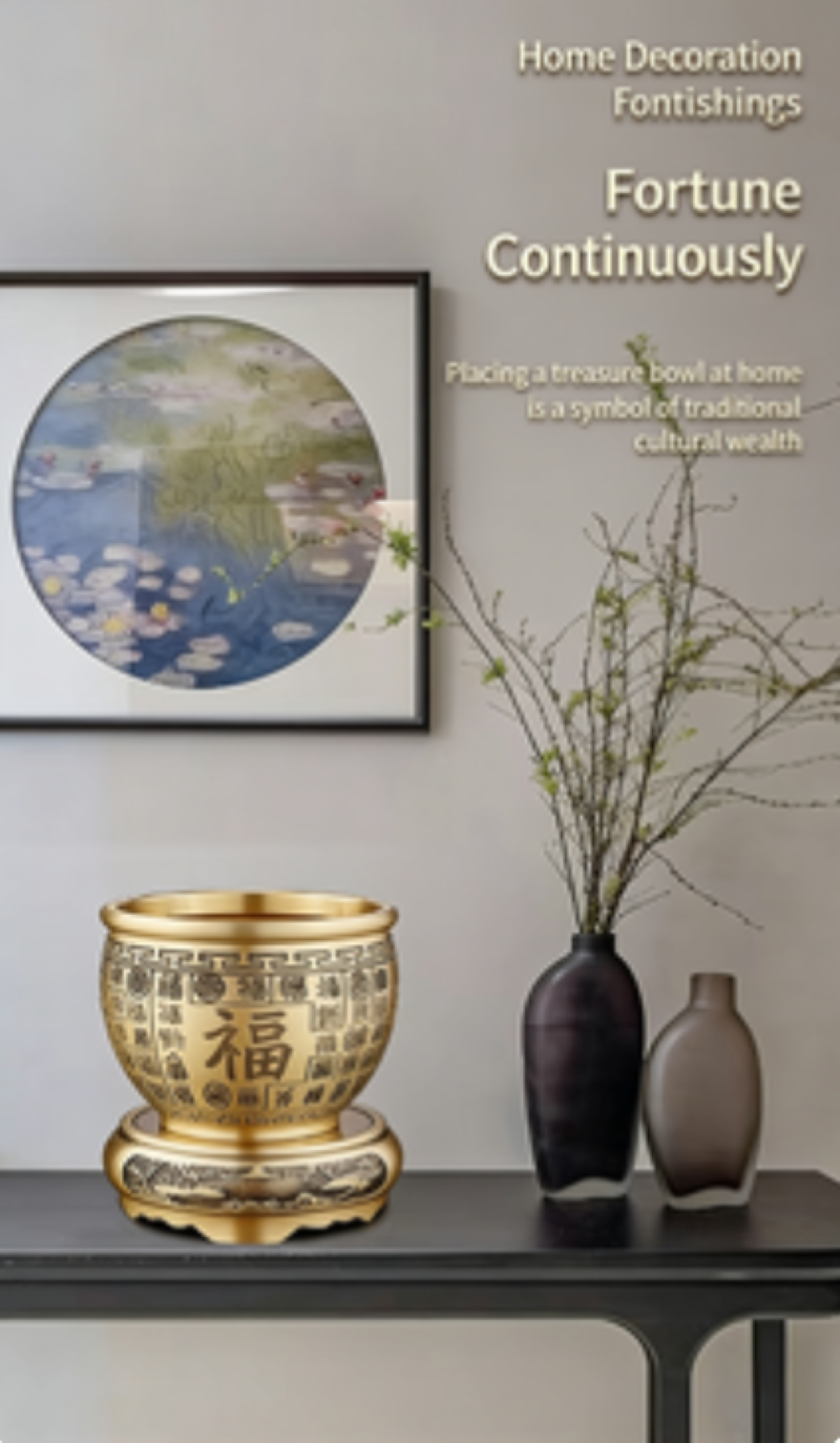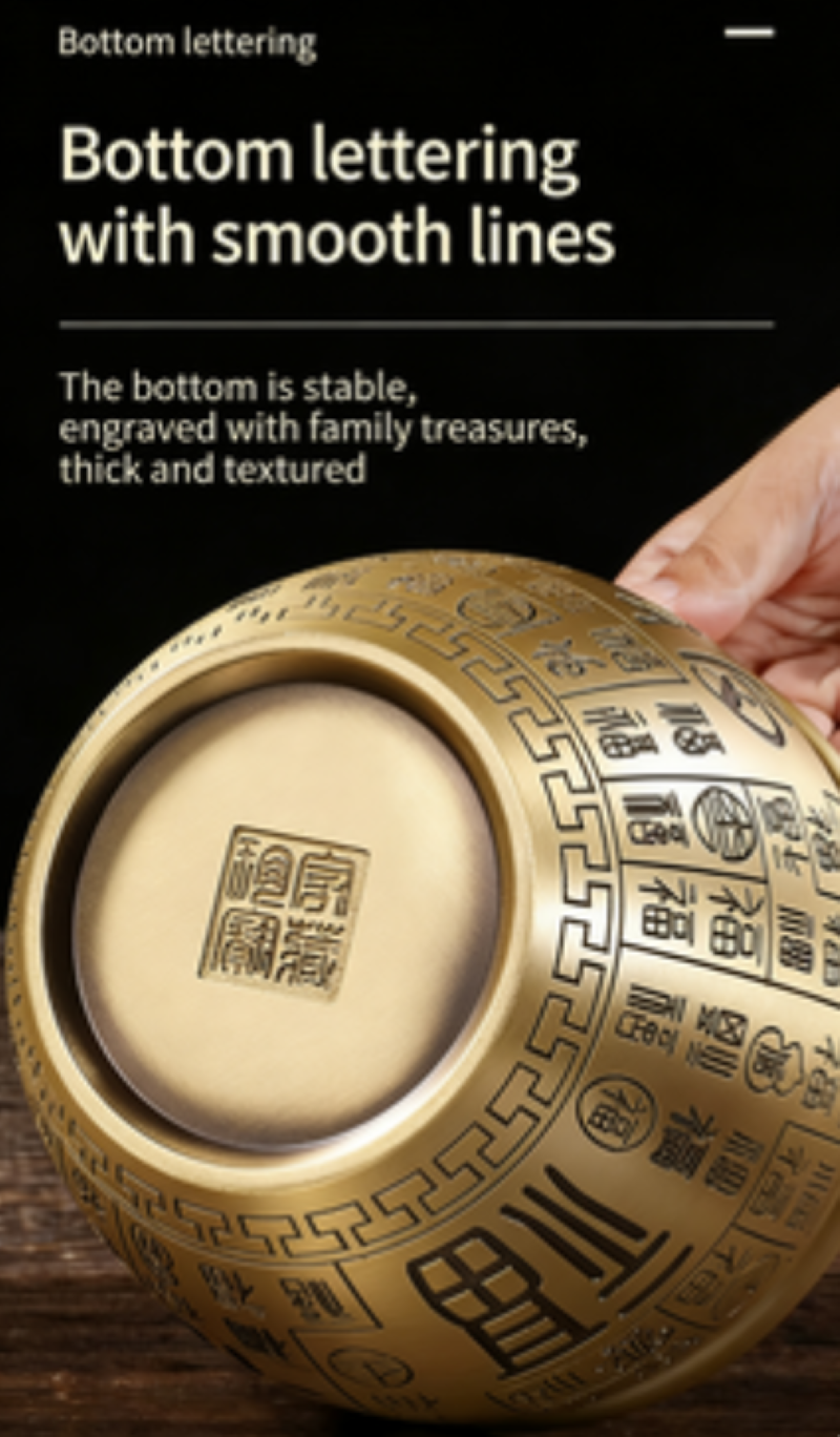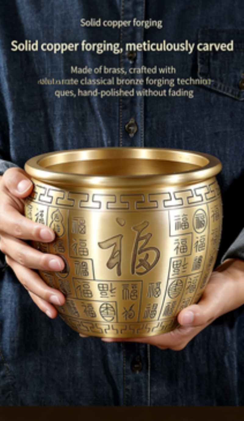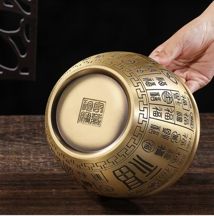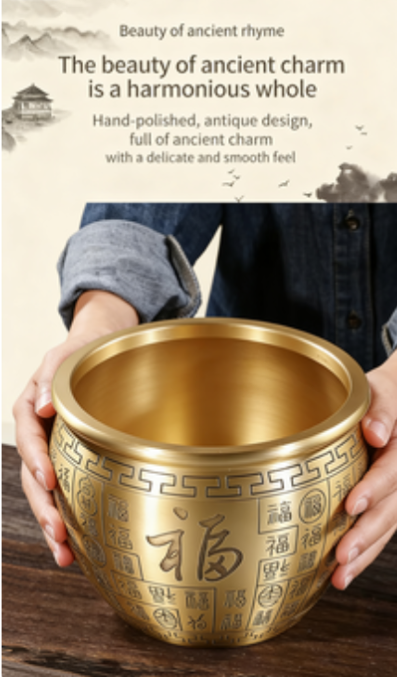 Esta bacia de cem bênçãos é meticulosamente forjada de latão puro. A bacia é redonda e rechonchuda, com linhas suaves e naturais, emitindo um brilho antigo e elegante. Na bacia, numerosos caracteres "Fu" estão gravados com detalhe, cada um com formato e pia batismal diferentes. Alguns são solenes e grandiosos, enquanto outros são vivos e graciosos, simbolizando bênçãos abundantes e boa sorte duradoura. Esses personagens "Fu" cercam a bacia, como se formassem um poderoso campo magnético de bênçãos, prendendo felicidade e auspicio dentro dela.