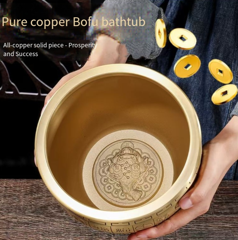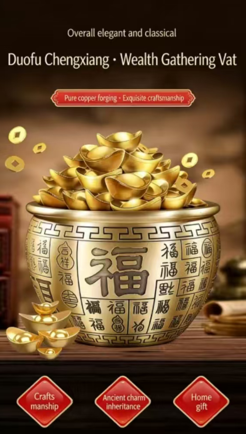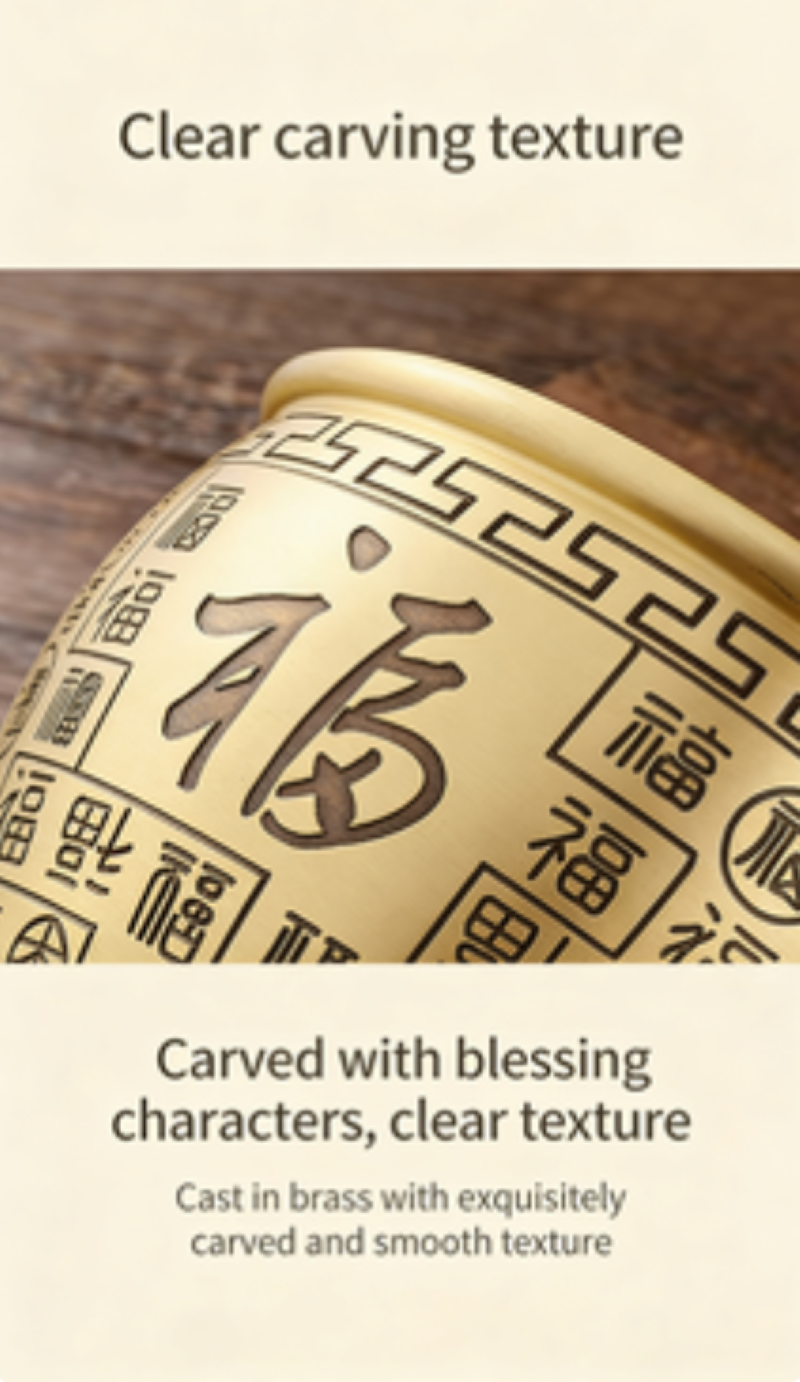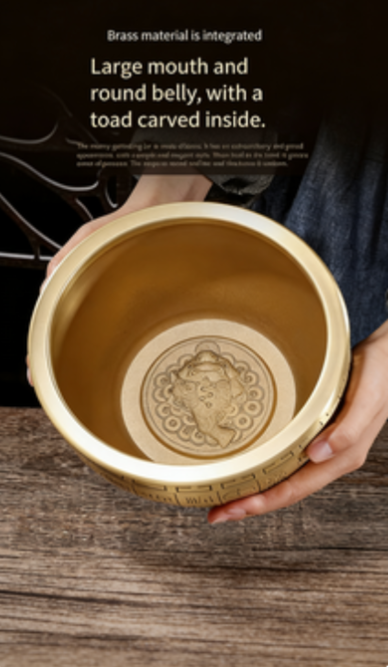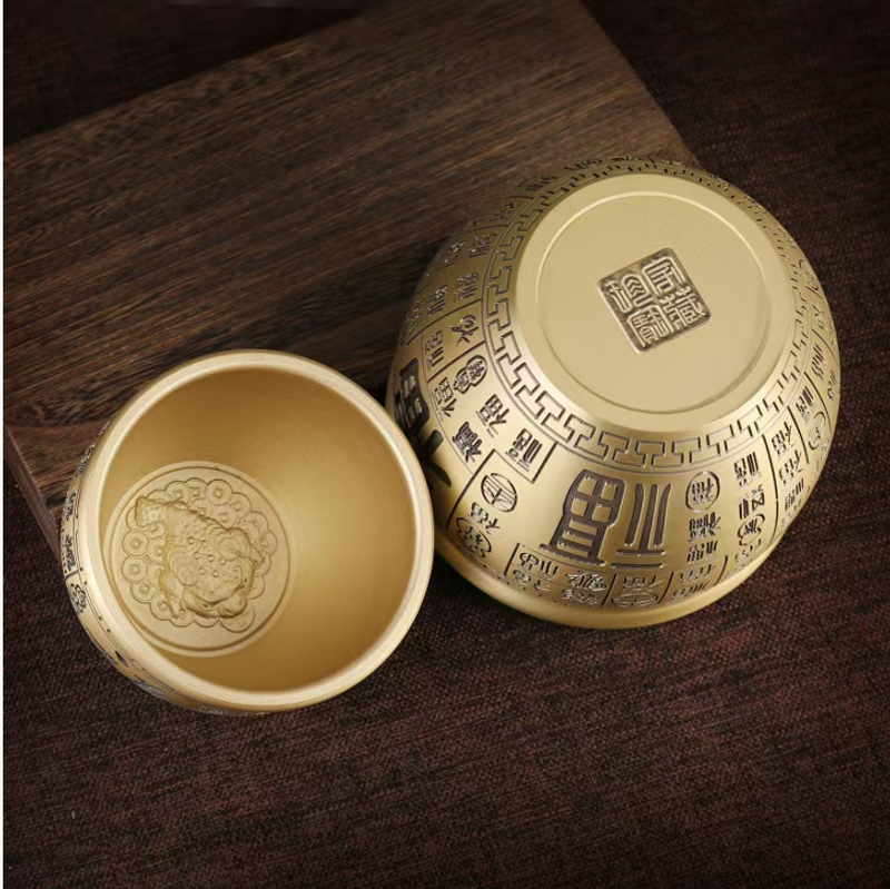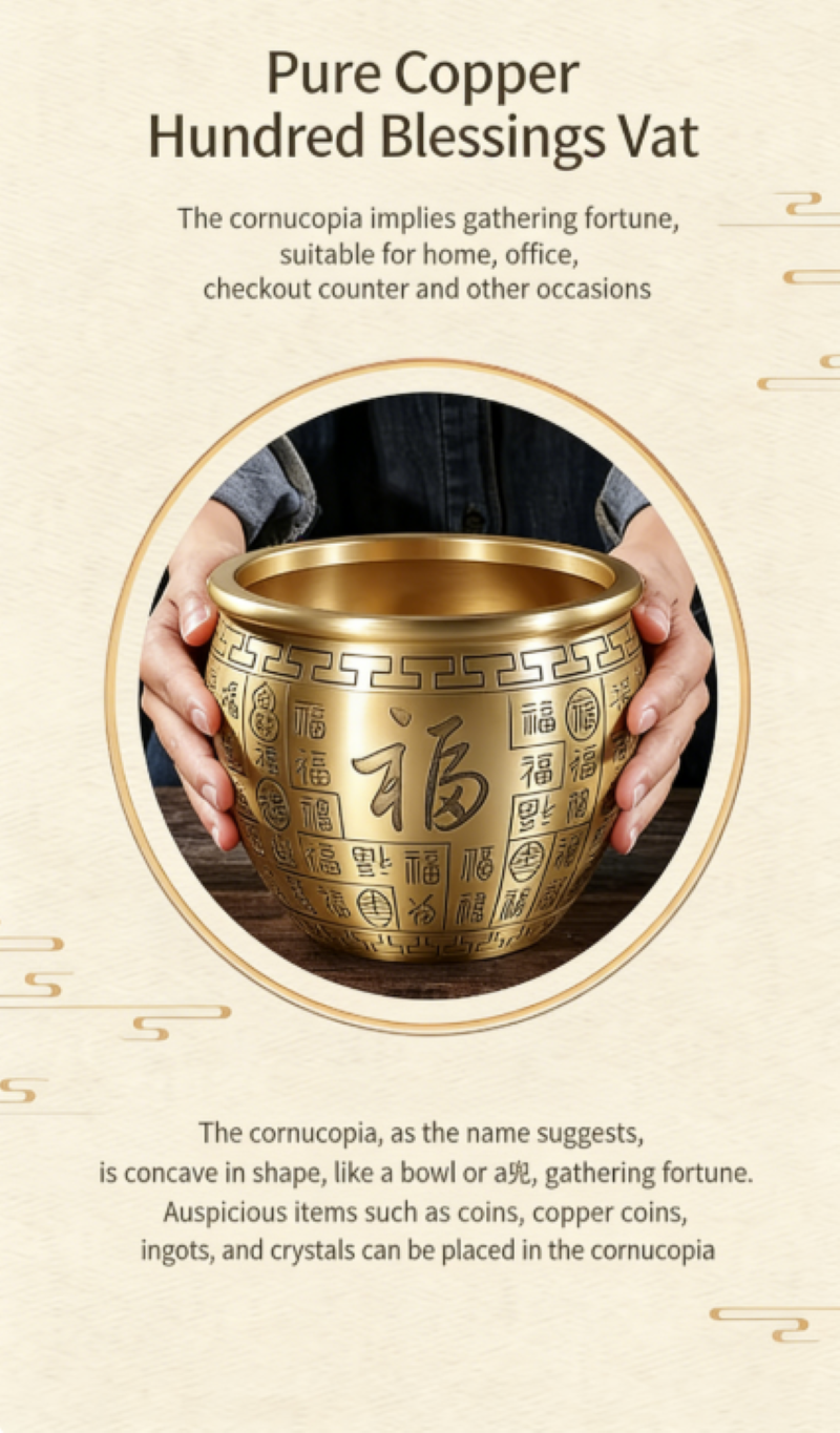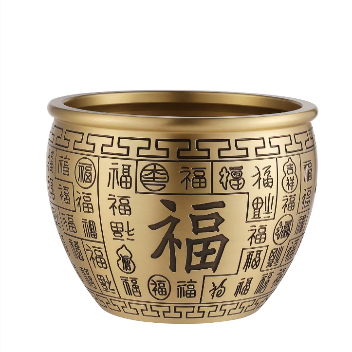 Esta bacia de cem bênçãos é meticulosamente forjada de latão puro. A bacia é redonda e rechonchuda, com linhas suaves e naturais, emitindo um brilho antigo e elegante. Na bacia, numerosos caracteres "Fu" estão gravados com detalhe, cada um com formato e pia batismal diferentes. Alguns são solenes e grandiosos, enquanto outros são vivos e graciosos, simbolizando bênçãos abundantes e boa sorte duradoura. Esses personagens "Fu" cercam a bacia, como se formassem um poderoso campo magnético de bênçãos, prendendo felicidade e auspicio dentro dela.