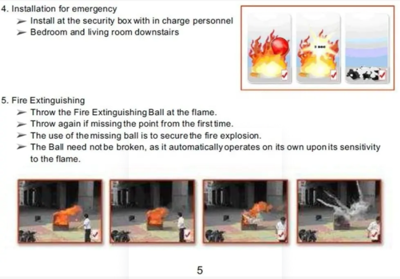 Em cenários familiares, os pontos de risco de incêndio em cozinhas, salas de estar e quartos, uma bola de extinção de incêndio pode formar uma zona de segurança local;