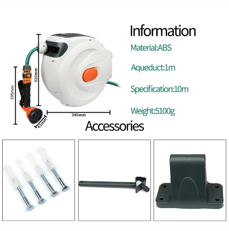 É um "gerenciador inteligente" para armazenamento de tubulações de água, equipado com um sistema de recuperação automática. Um tubo de água de PVC de 50 pés (aproximadamente 15 metros) pode ser esticado livremente de acordo com a necessidade, e a quantidade esticada pode ser usada completamente. Quando não estiver em uso, pode ser retraído automaticamente com um toque suave. Isso elimina completamente o problema tradicional de canos de água serem "irrecuperáveis e inadequados para armazenamento".