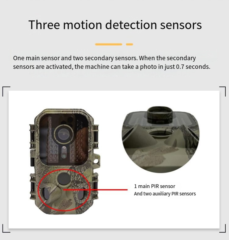 Three motion detection sensors form an intelligent sensing network. Once an animal enters the detection range, it will quickly trigger the shooting, capturing the wonderful moments with "zero delay" response, never missing any natural mystery. At the same time, it has a waterproof camouflage appearance, which can perfectly blend into various outdoor environments such as jungles and mountains, with extremely strong concealment, allowing animals to display their most natural behavior without being noticed.