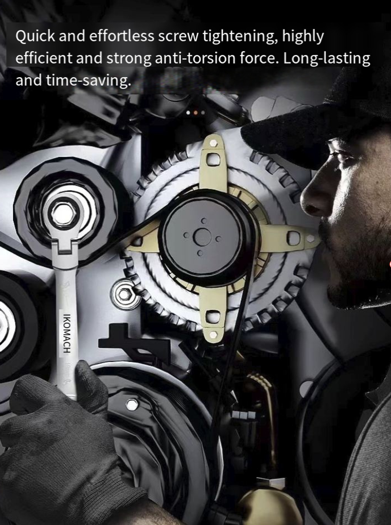 A catraca de precisão de 72 dentes pode mudar de direção em apenas 5 graus. A alavanca pode ser facilmente alternada entre configurações apertadas e soltas. Ela pode apertar parafusos rapidamente mesmo em furos profundos, e sua eficiência é o dobro da das chaves comuns. O material de aço CR-V cromo-vanádio é cromado para prevenção de ferrugem, e não escorrega nem se desgasta mesmo quando usado em óleo, água ou manchas. É durável e resistente.