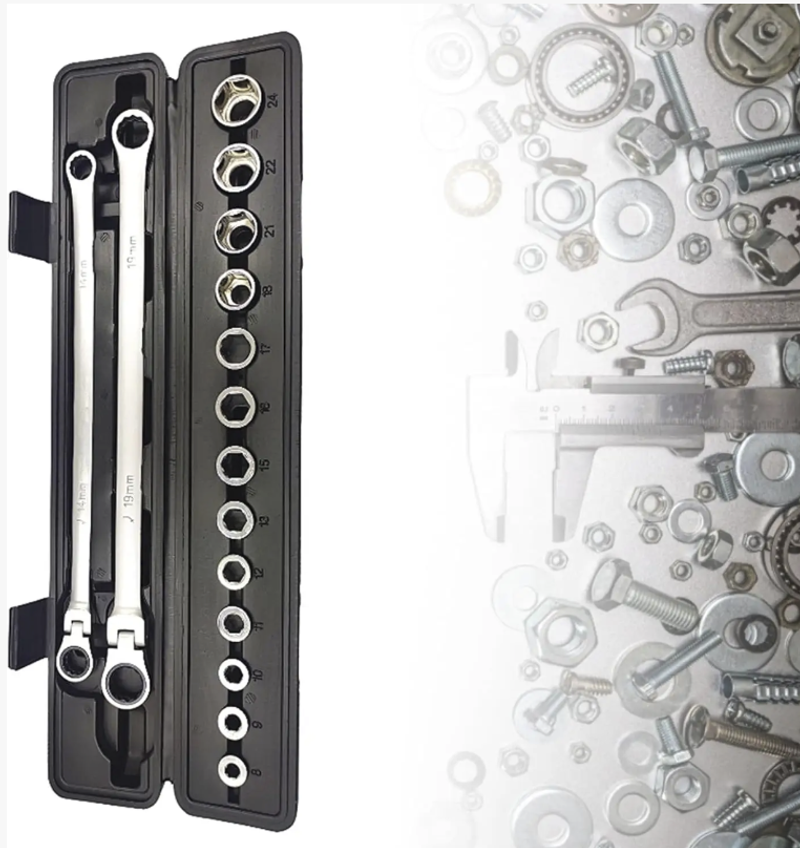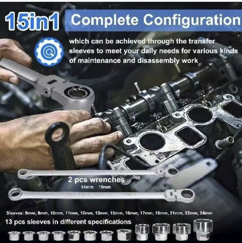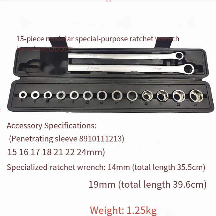 A configuração de tamanho completo de 15 peças cobre várias necessidades: desde parafusos minúsculos até parafusos grandes, correspondentes a 13 soquetes de tamanhos diferentes. Seja desmontando pneus e componentes do chassi durante reparos automotivos ou montando móveis e consertando canos durante reformas residenciais, ele pode "lidar com tudo de uma vez só". O design ativo de longo alcance permite que a cabeça da chave ajuste o ângulo de forma flexível, adaptando-se a várias posições complicadas de instalação, eliminando completamente o desconforto de "a chave não ser potente o suficiente".