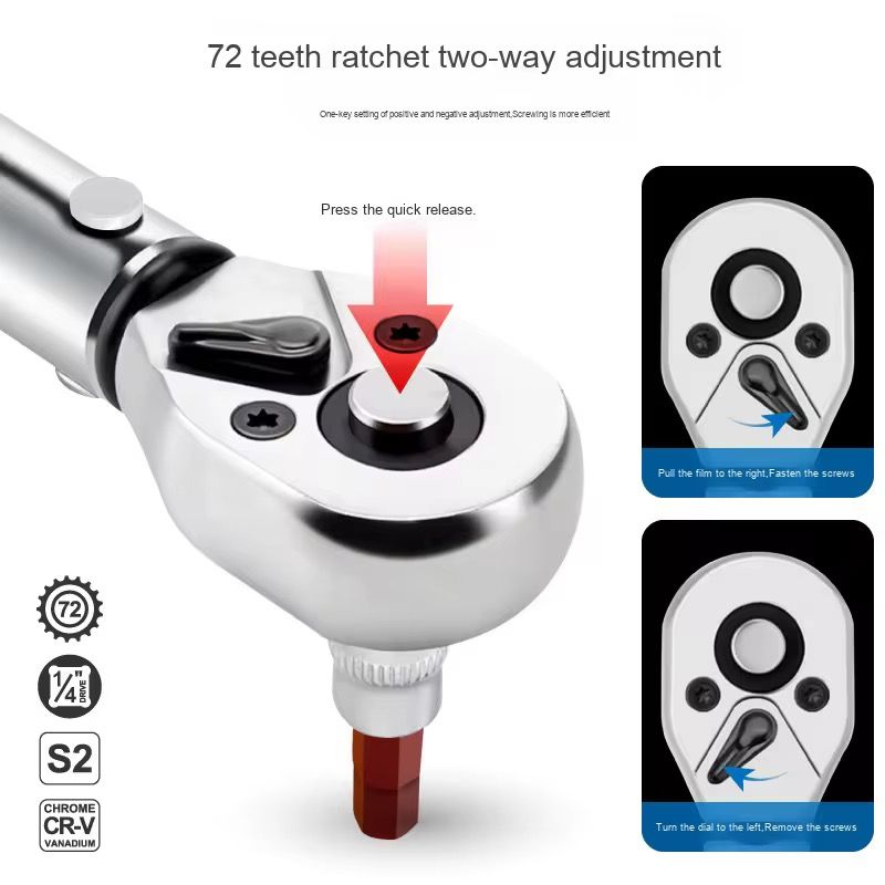 O núcleo desse produto é o controle de torque de alta precisão: a cabeça de catraca de 72 dentes funciona suavemente, e o ajuste de torque é preciso até 0,1 N·m. Ao apertar, ele se desengata automaticamente e faz um som de "clique" ao atingir o torque pré-definido, evitando apertar demais e danificar as peças ou riscos de aperto insuficiente. É especialmente adequado para a montagem precisa de motocicletas, pequenas peças de automóveis e dispositivos eletrônicos.
