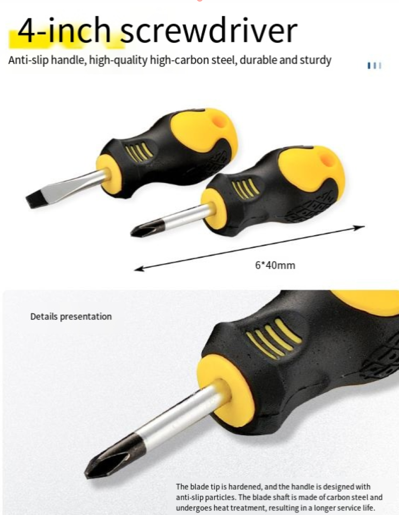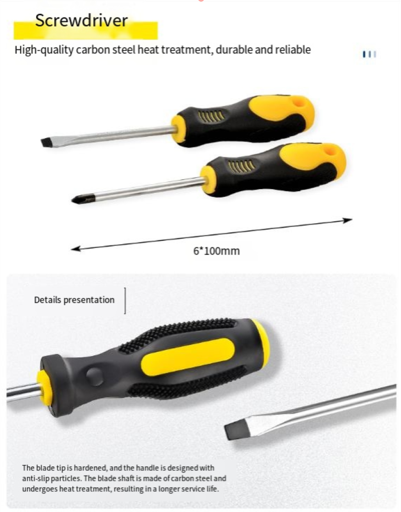 As ferramentas são feitas de aço de alto carbono e passam por tratamento de têmpera, com alta dureza e forte tenacidade. As chaves de fenda não escorregam ao apertar os parafusos, o alicate tem forte poder de corte sem lascar e pode exercer força precisa para tarefas como aperto de encanamento, montagem de móveis e perfuração de parede para nivelamento.