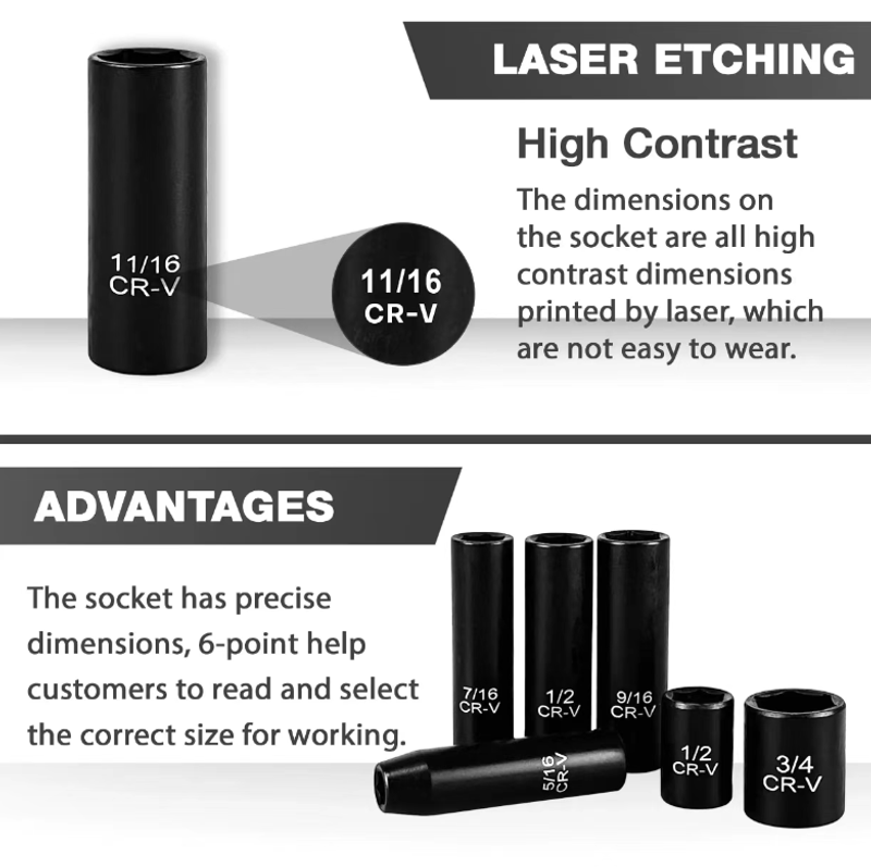 Os soquetes e acessórios são feitos de aço de alta qualidade com cromo-vanádio, com um tratamento especial de superfície para prevenir ferrugem, resistência ao desgaste e forte resistência a impactos. Mesmo em operações de impacto de alta intensidade, eles têm menos probabilidade de deformar ou rachar. A escala gravada a laser é transparente e resistente ao desgaste, podendo ser rapidamente identificada pelo tamanho ao longo de um longo período de uso, evitando o constrangimento de escolher a ferramenta errada.