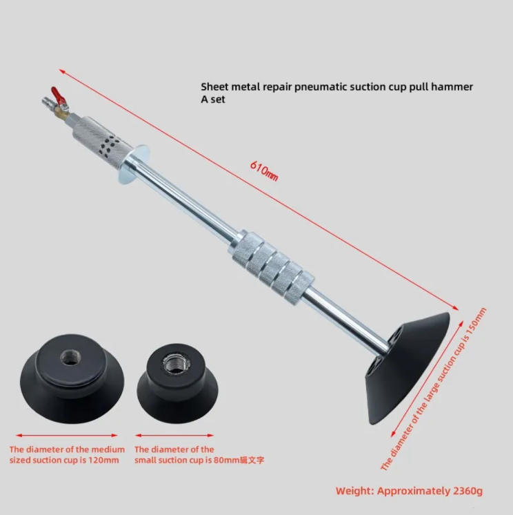 Contando com o sistema de energia pneumática, o ar comprimido é convertido em forte força de tração e a potência excede em muito a dos martelos de tração manuais. A principal vantagem do "modelo de grande porte" reside em uma área de contato com ventosa maior + um curso de martelo de tração mais longo. Ele pode superar facilmente grandes depressões (como amassados de colisão de portas de carros) e depressões profundas (como poços de arranhões de pára-choques). Com apenas um puxão, a chapa metálica pode ser rebatida e reposta, sem a necessidade de operações repetidas, melhorando significativamente a eficiência do reparo. Mesmo mecânicos de automóveis experientes elogiarão sua "eficiência".