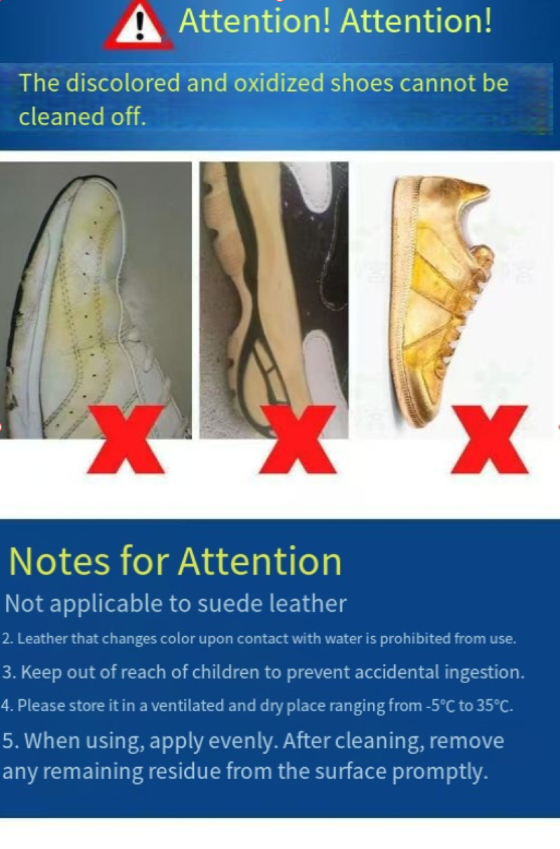 Com esse creme de limpeza, você não precisa mais se preocupar com problemas como separação da cola, deformação e amarelecimento dos sapatos causados pela lavagem frequente. Ele limpa instantaneamente e resolve facilmente todo tipo de problema de limpeza, mantendo seus sapatos em perfeitas condições o tempo todo.