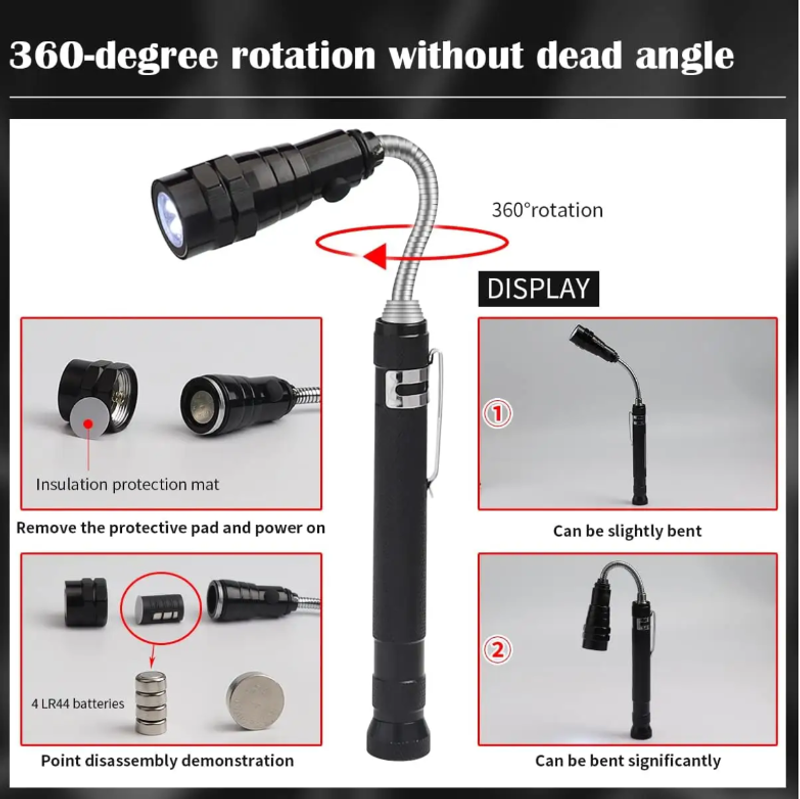 Também está equipado com 3 lâmpadas LED de alta intensidade, proporcionando brilho suficiente e longo alcance. Mesmo em cantos escuros, ele pode iluminar de forma clara e transparente, permitindo que os detalhes finos das pequenas peças sejam claramente vistos. A haste retrátil é feita de material metálico resistente à ferrugem, a mangueira é flexível e suporta flexões, a lanterna tem longa duração da bateria e é durável e confiável para diversas situações, como reparos diários do carro, reforma residencial e limpeza residencial.