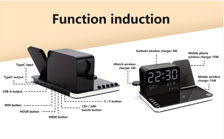 É o "mestre da organização" da área de trabalho, coletando cabos de carregamento bagunçados e dispositivos digitais espalhados, tornando a área de trabalho instantaneamente de "caótica e desordenada" para "arrumada e ordenada". O módulo de relógio integrado exibe claramente a hora e a data, servindo como uma estação de carregamento e um prático relógio de mesa. É mais conveniente verificar a hora da manhã ou verificar a programação no trabalho.