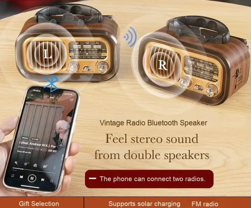 Sua aparência retrô pode ser considerada uma cápsula do tempo: a caixa de textura de madeira combinada com botões e mostradores de metal recria a sensação clássica dos equipamentos de rádio do século passado. Colocado em casa, é a "versão de estilo" de móveis macios e, na mão, é a "posição C de nível de aparência" de uma cena ao ar livre. O que é ainda mais incrível é que ele suporta conexão Bluetooth de dispositivo duplo, permitindo que seu telefone se conecte simultaneamente a dois dispositivos, criando instantaneamente um campo de som surround. Em uma festa campal ou enquanto ouve música em casa, você pode desfrutar de uma experiência auditiva no nível do cinema.