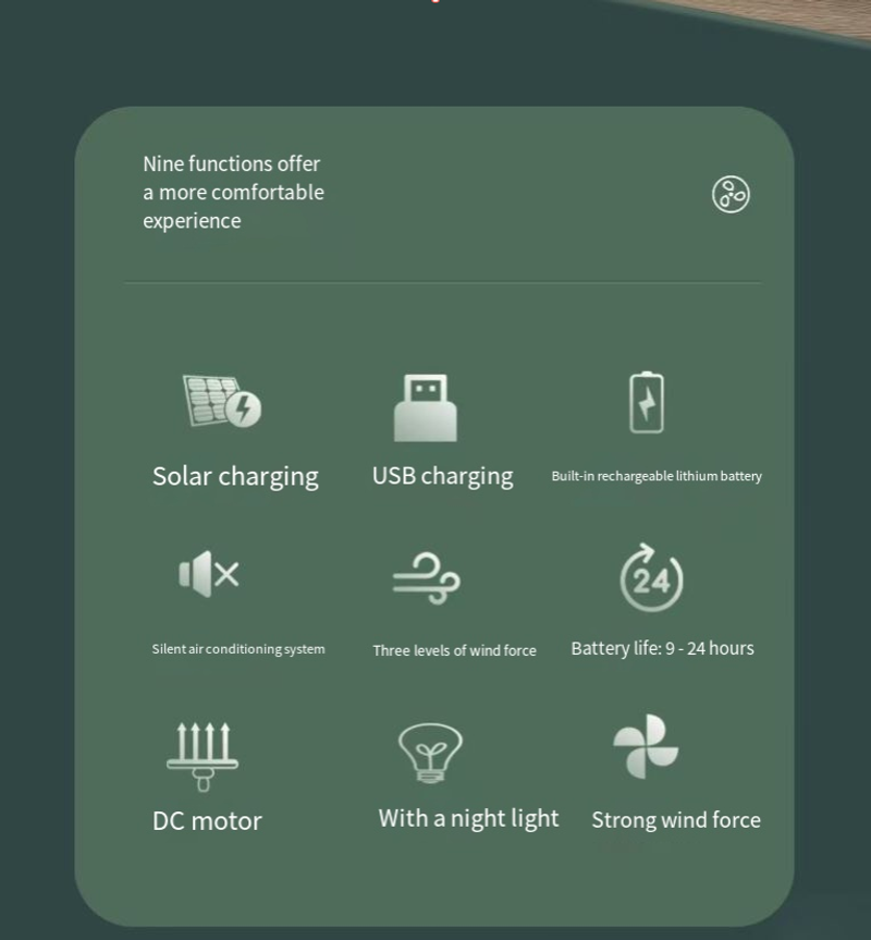 Agora, deixe-o quebrar sua "dependência de eletricidade", aproveite o "frescor a qualquer hora, em qualquer lugar" com a fonte de alimentação dupla de luz solar e USB!