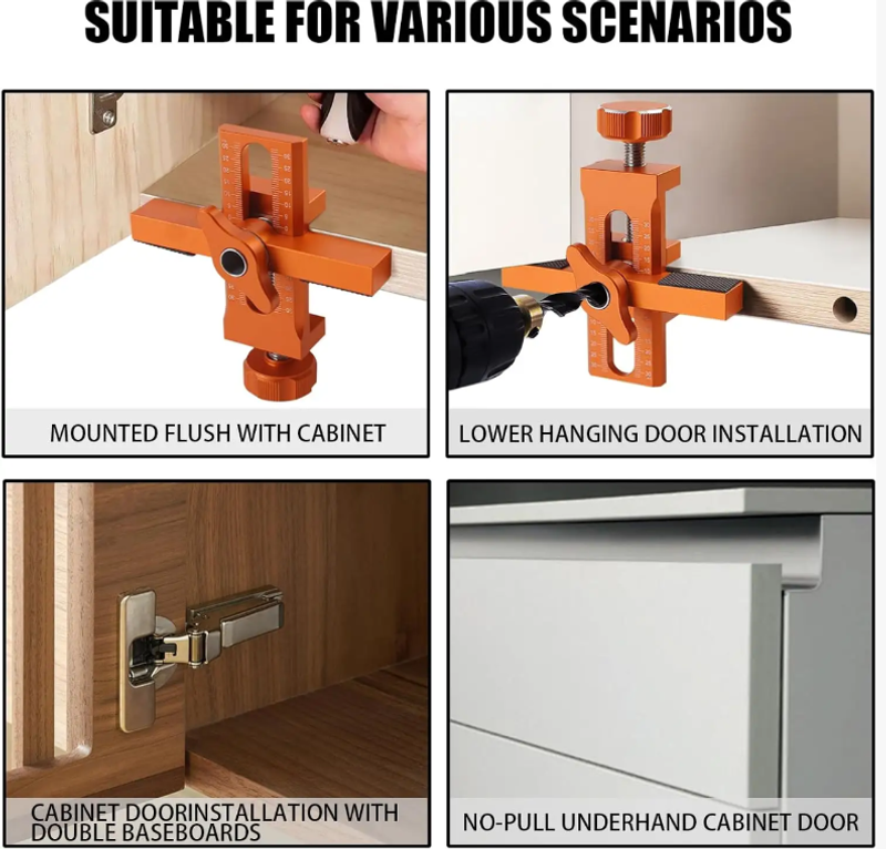 No passado, ao trabalhar com marcenaria, era preciso confiar em mão firme ou em desperdiçar materiais. Agora, com seu posicionamento preciso, os furos não serão perfurados de forma desigual e as juntas não serão inclinadas. Isso não só economiza materiais, mas também melhora a qualidade. Seja para entusiastas da marcenaria que fazem faça-você-mesmo ou para trabalhadores de melhorias residenciais correndo para concluir tarefas, é um equipamento eficaz e confiável que pode "melhorar a eficiência e reduzir erros". O corpo principal é feito de liga de alumínio à prova de ferrugem, que é resistente a choques e não se deforma. A abertura de fixação é equipada com almofadas de borracha antiderrapante, para que, ao prender a porta do armário, não arranhe o painel. Você pode usar madeira maciça, placa densa e placa acrílica com segurança. Mesmo após a instalação da porta do armário, ela permanece intacta.