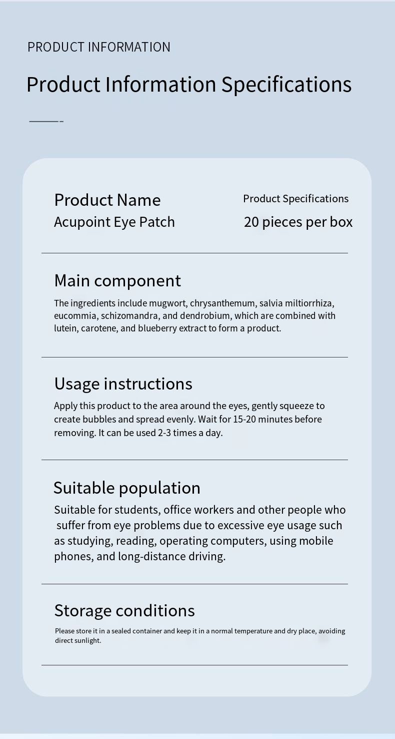 O adesivo protetor para os olhos recomendado pela Academia Chinesa de Ciências Sociais contém 9 essências de ervas principais, como artemísia e zeaxantina. Estimula precisamente os pontos de acupuntura ocular, aliviando a secura, irritação e fadiga e melhorando a visão turva. É uma excelente ferramenta de proteção para os olhos, deixando os olhos úmidos e brilhantes. Encomende hoje e você receberá 3 caixas, totalizando 60 patches.
